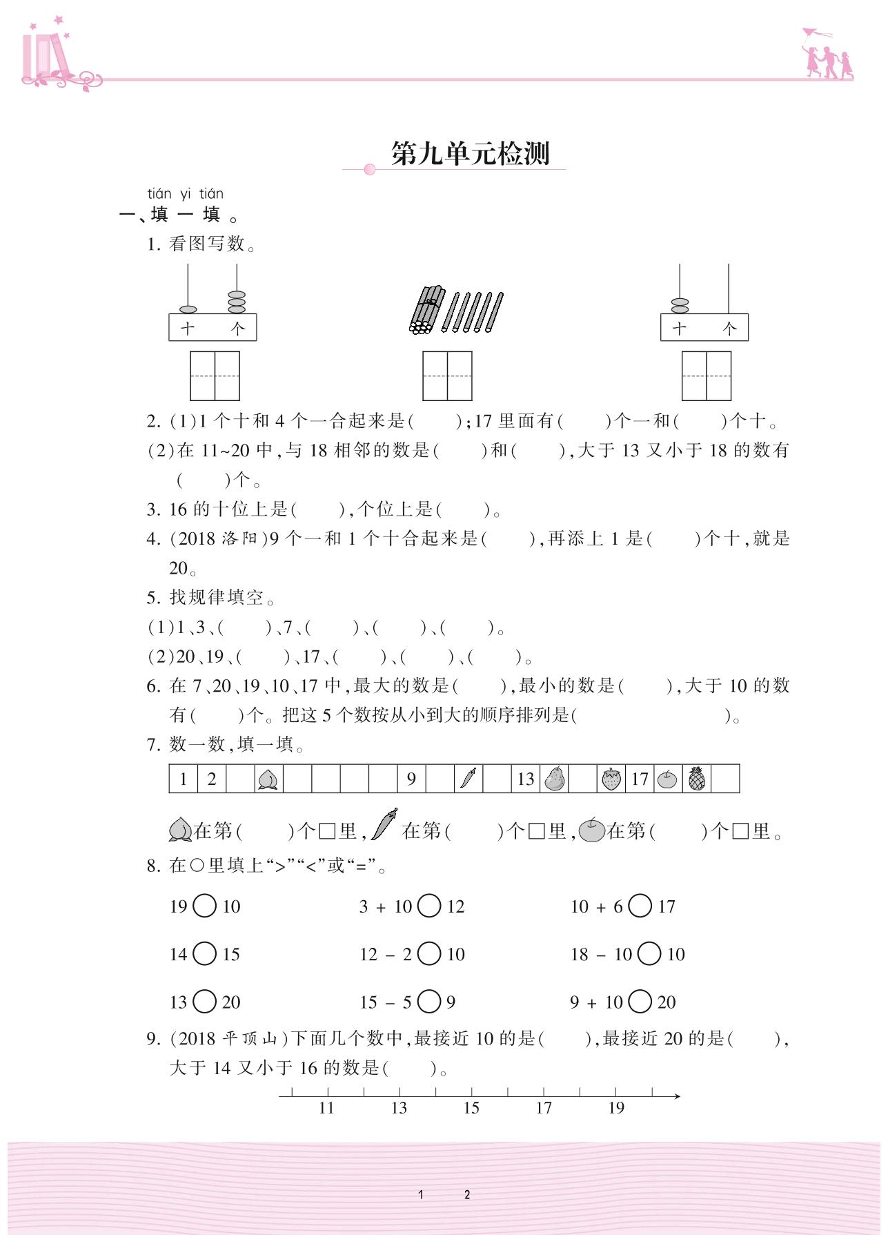 2020上册一年级数学苏教版 第九单元检测