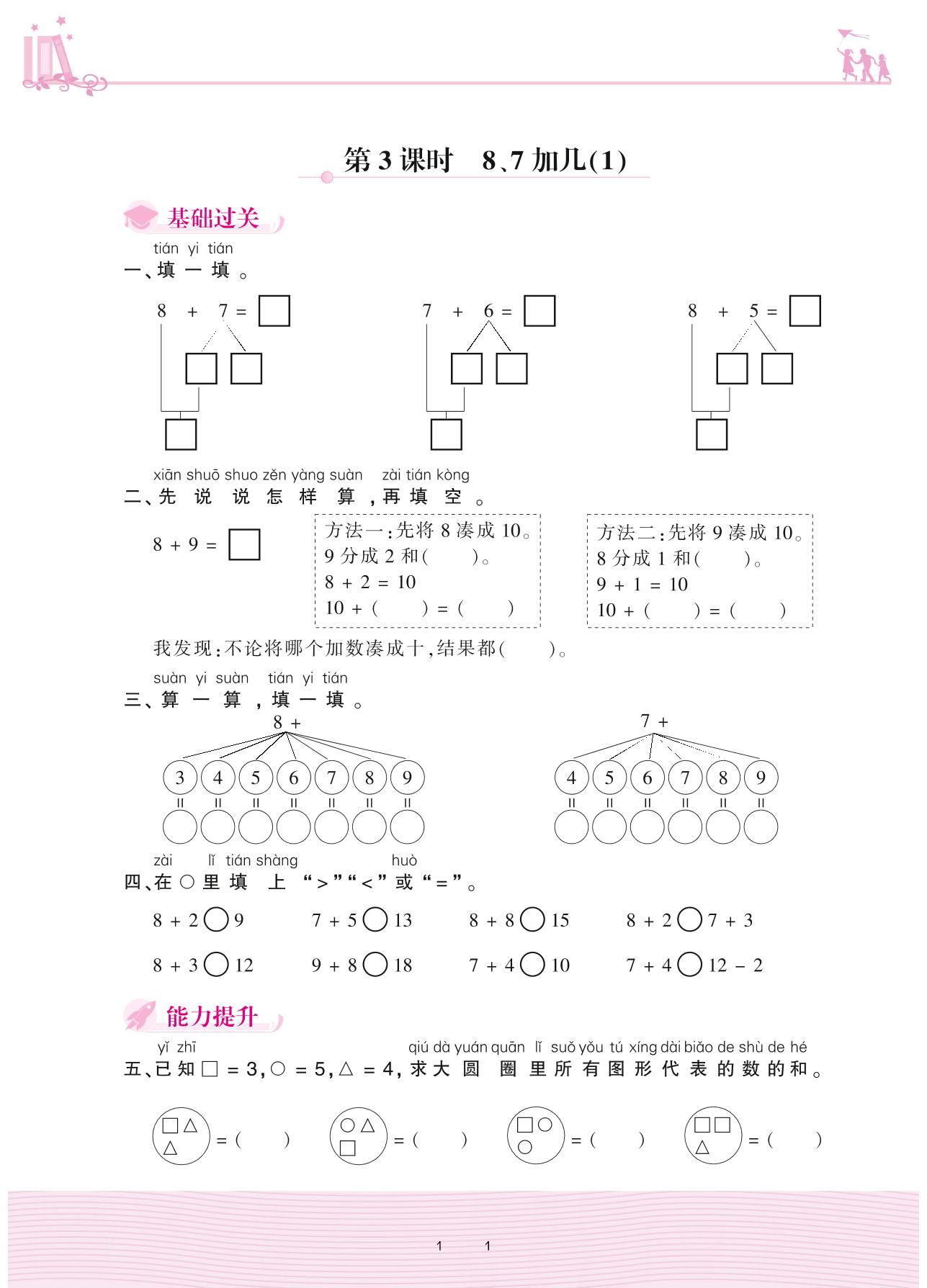 2020上册一年级数学苏教版 十 20以内的进位加法——第3课时 8、7加几(1)