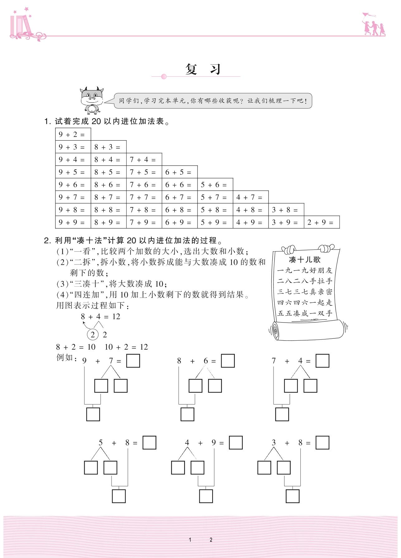 2020上册一年级数学苏教版 十 20以内的进位加法——复习