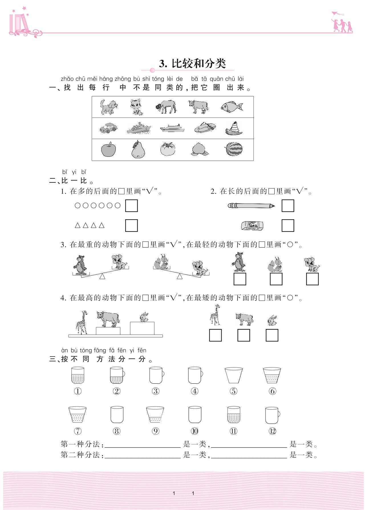 2020上册一年级数学苏教版 十一 期末复习——3. 比较和分类