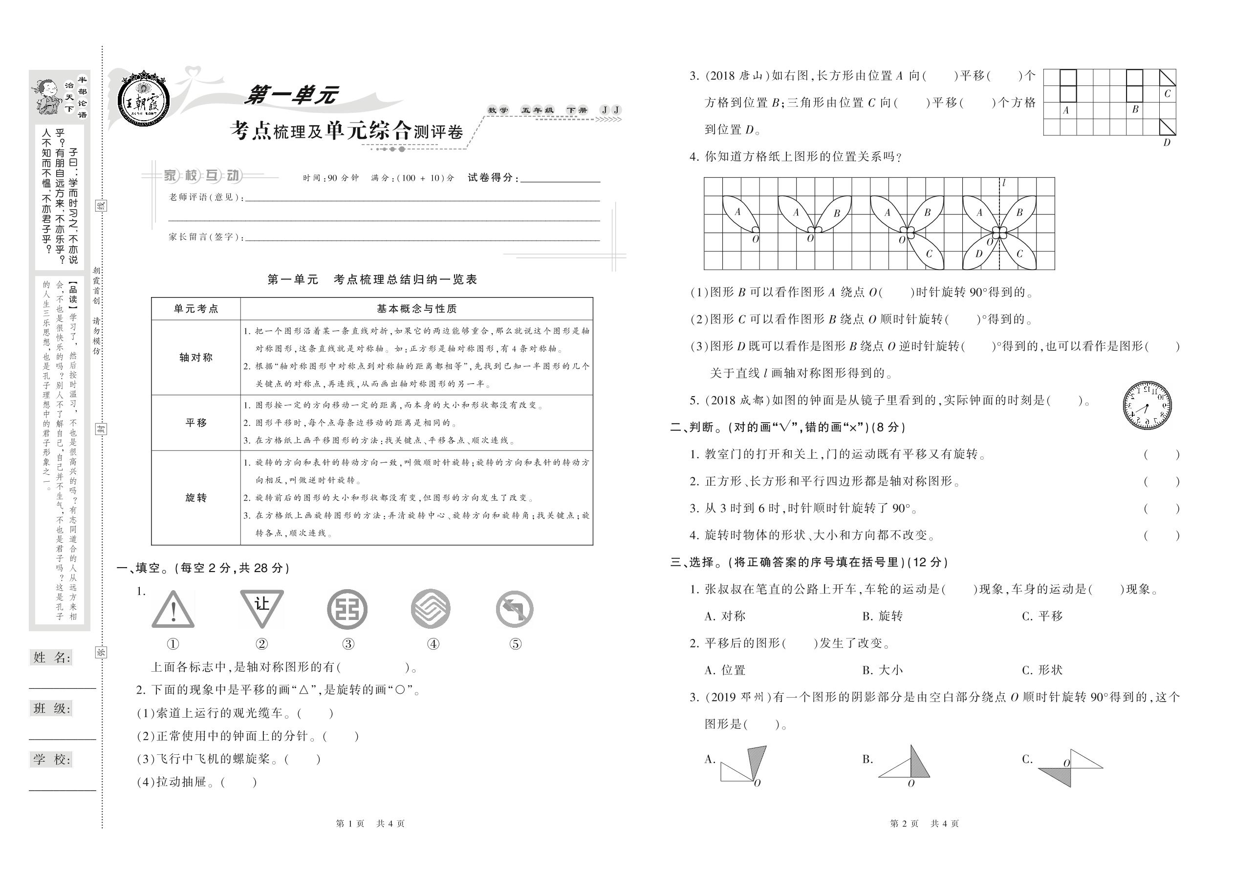 2021下册五年级数学冀教版 第一单元 考点梳理及单元综合测评卷