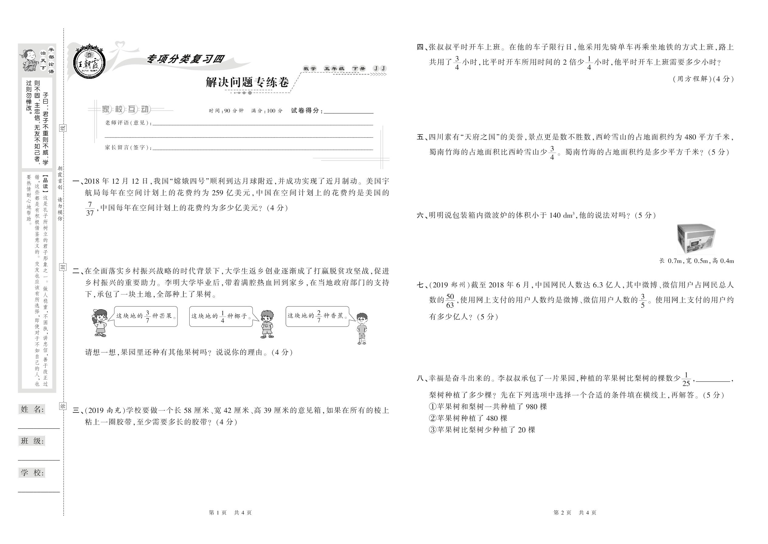 2021下册五年级数学冀教版 解决问题专练卷
