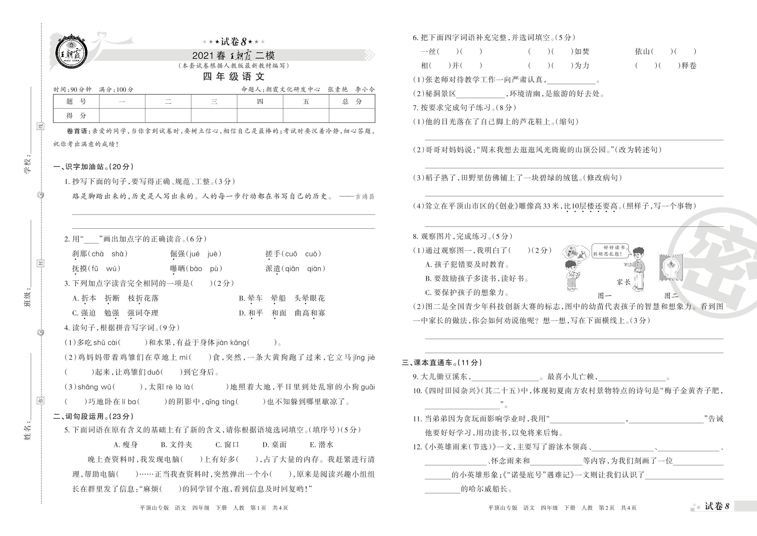 王朝霞期末模拟卷四年级下册语文(人教版)_R210801181848【8】