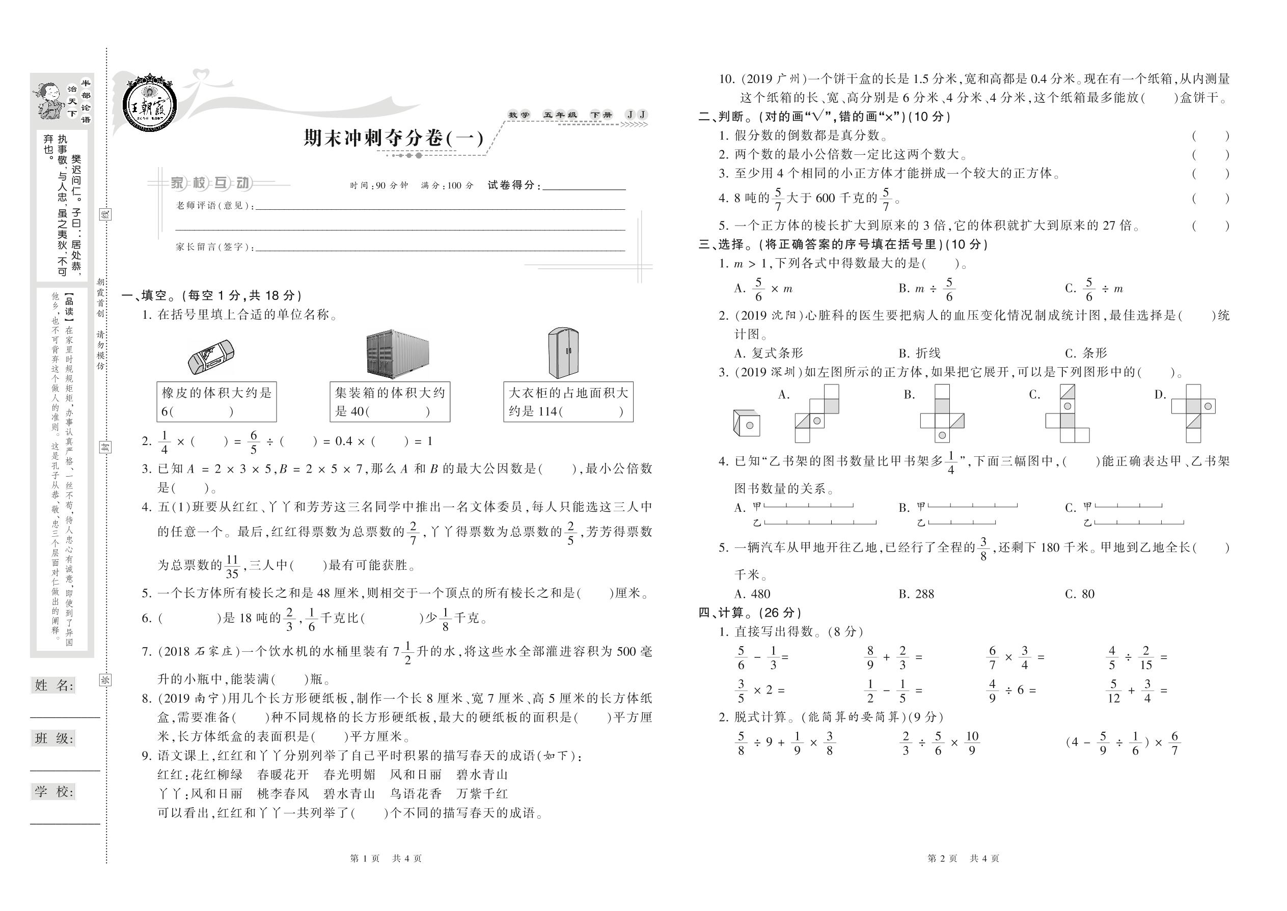 2021下册五年级数学冀教版 期末冲刺夺分卷(一)