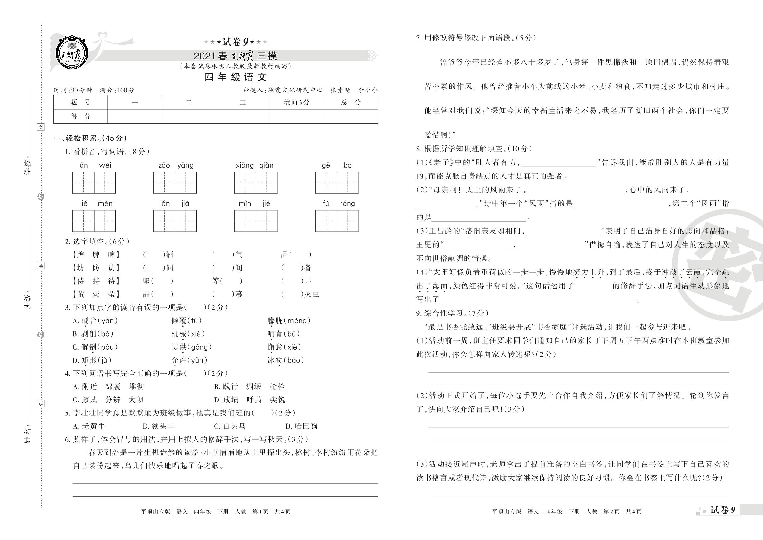 王朝霞期末模拟卷四年级下册语文(人教版)_R210801181854【9】