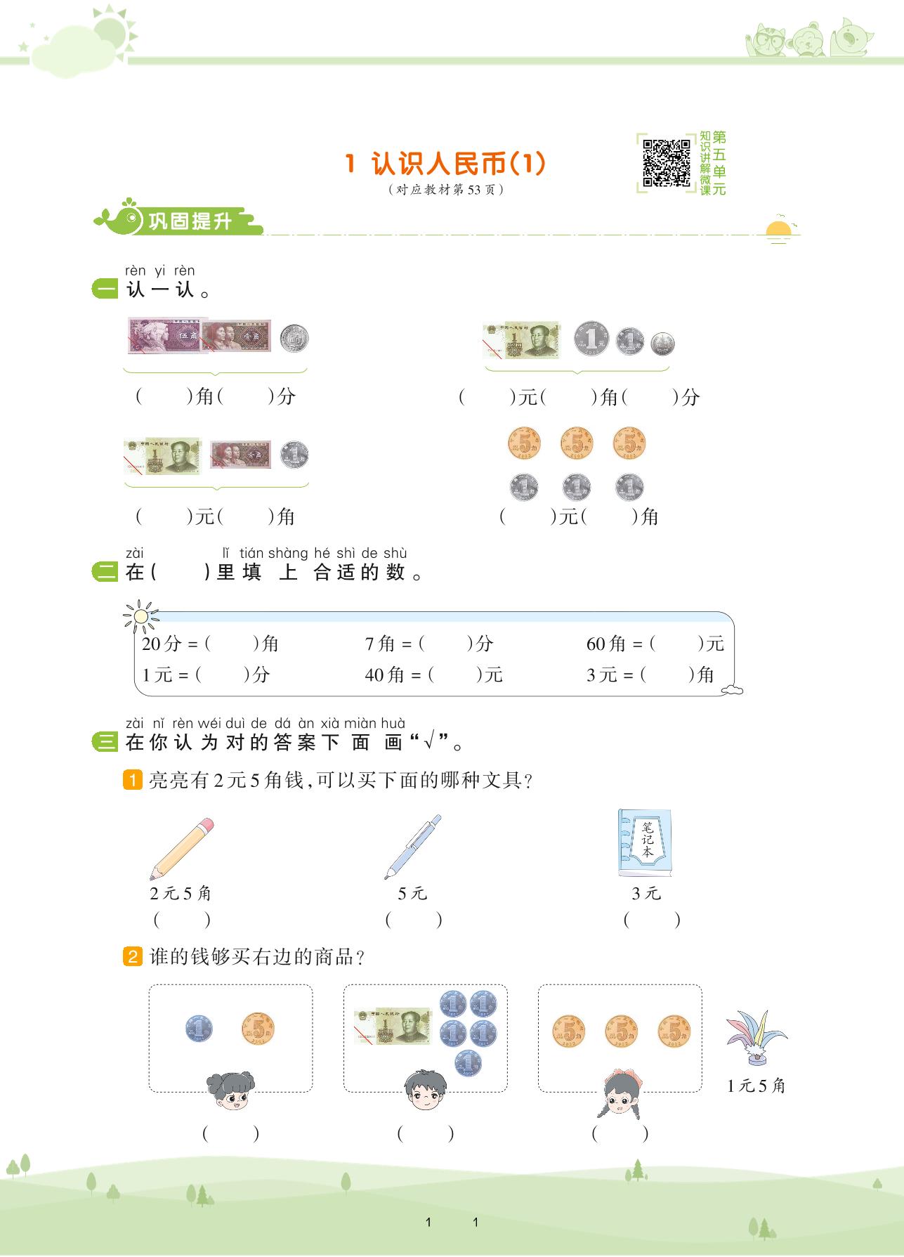 2021下册一年级数学人教版 第五单元 认识人民币——1 认识人民币(1)