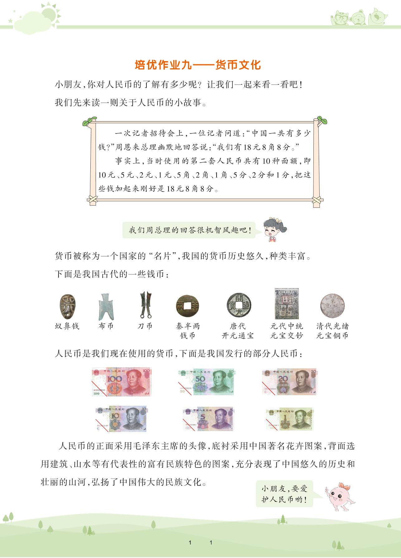 2021下册一年级数学人教版 第五单元 认识人民币——培优作业九 货币文化