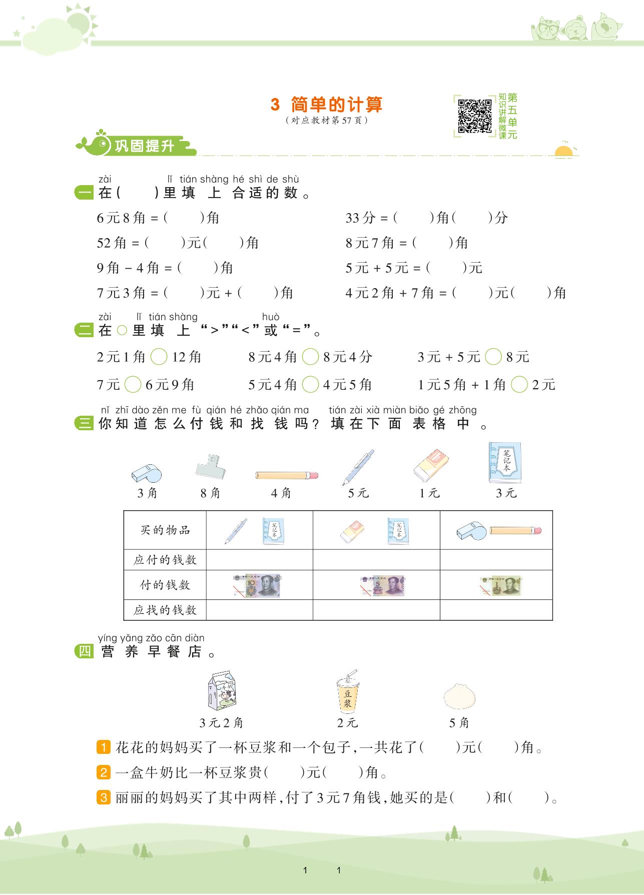 2021下册一年级数学人教版 第五单元 认识人民币——3 简单的计算