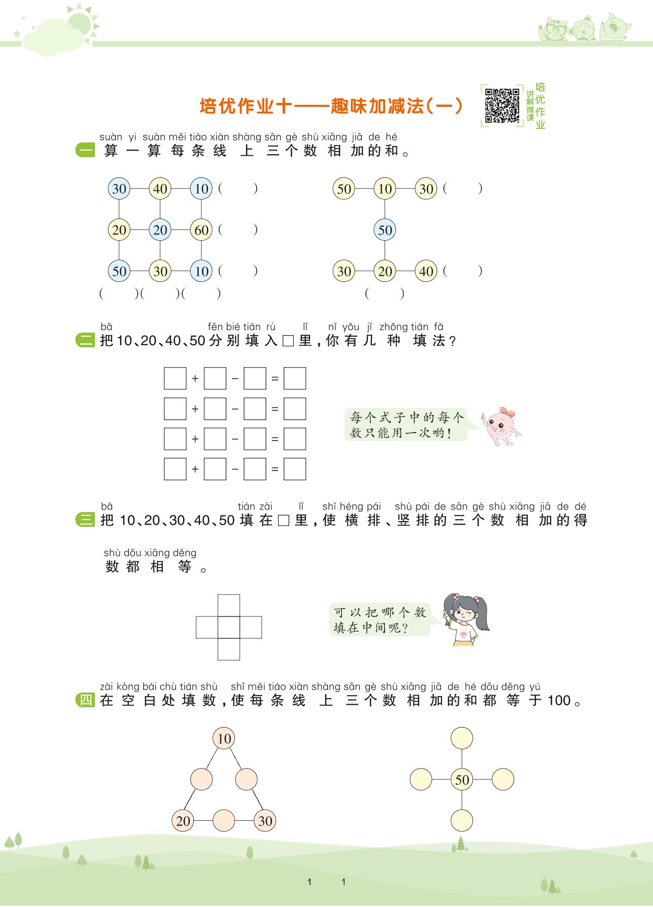 2021下册一年级数学人教版 第六单元 100以内的加法和减法(一)——培优作业十 趣味加减法(一)