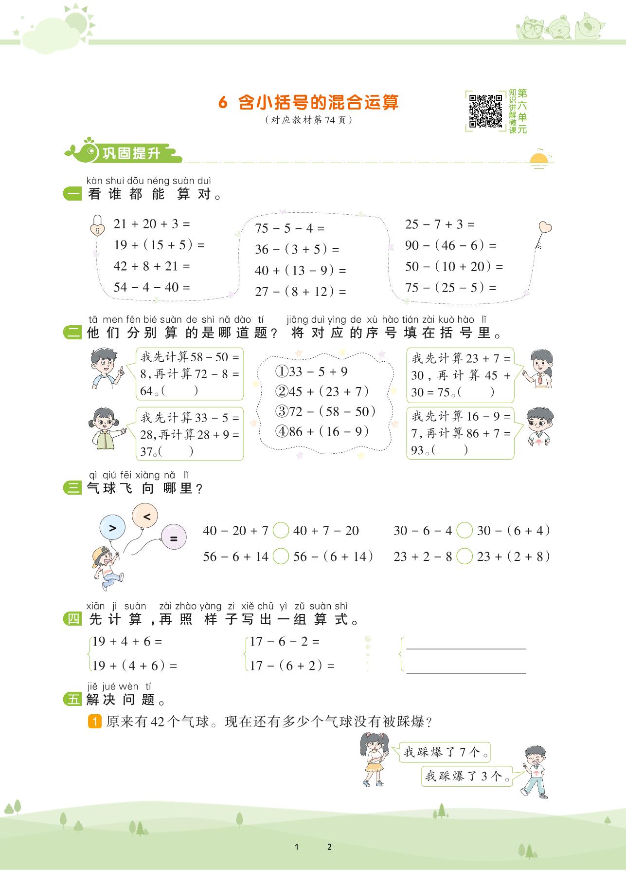 2021下册一年级数学人教版 第六单元 100以内的加法和减法(一)——6 含小括号的混合运算