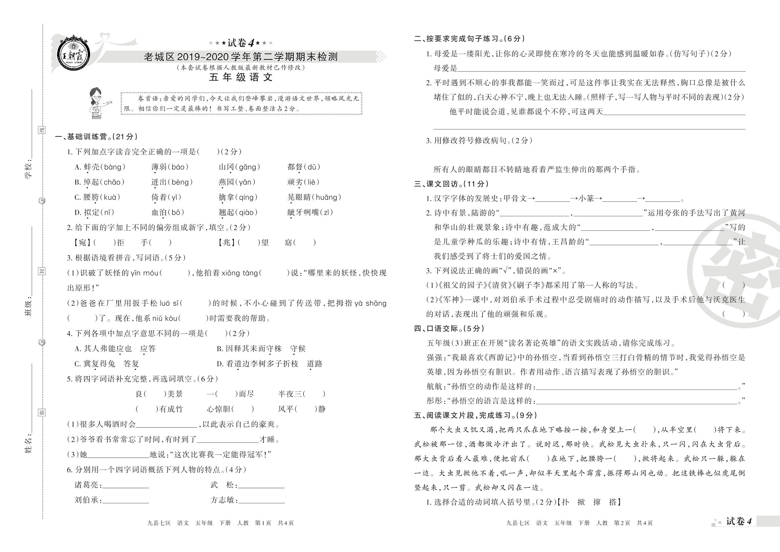 2019-2020学年第二学期洛阳市老城区五年级语文试卷(人教版)【4】
