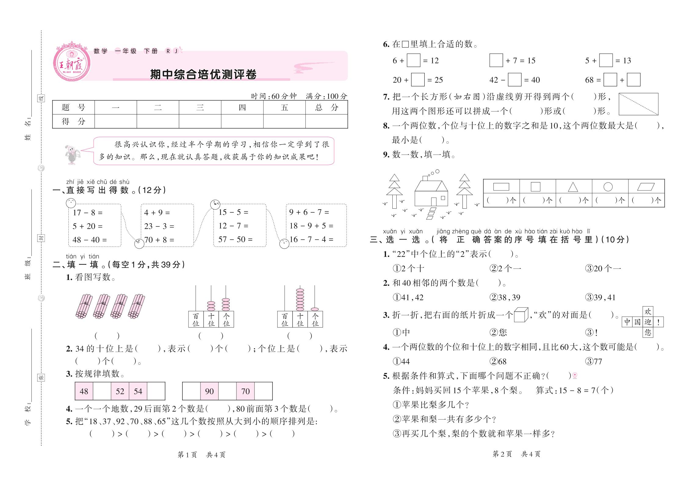 一年级数学人教版下册期中卷