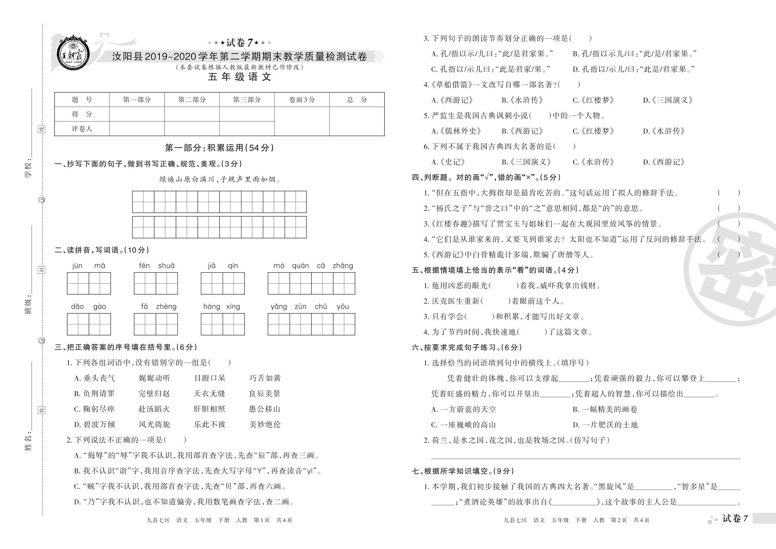 2019-2020学年第二学期洛阳市汝阳县五年级语文试卷(人教版)【7】