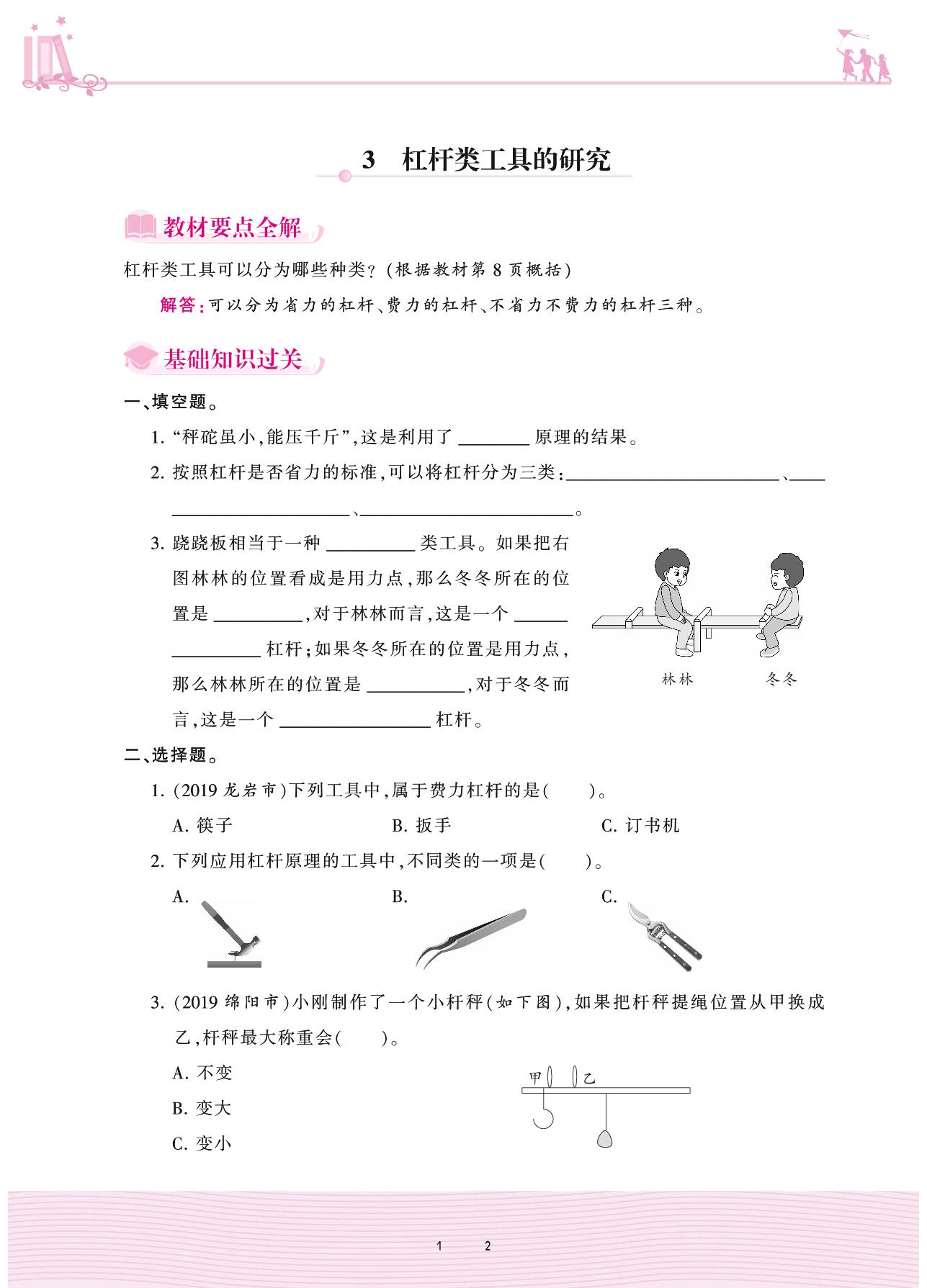2020上册六年级科学教科版 第一单元 工具和机械——3 杠杆类工具的研究