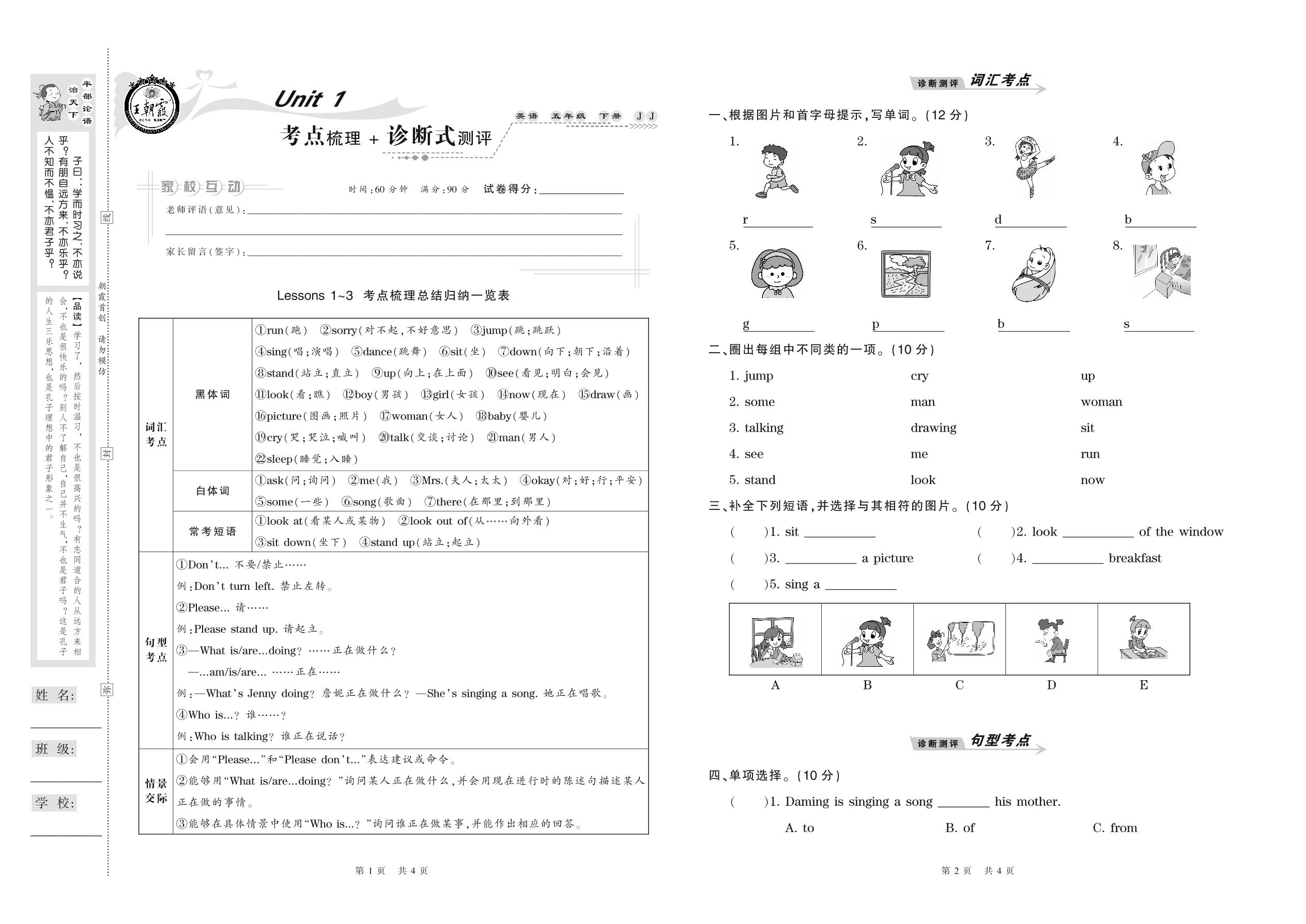 2021下册五年级英语冀教版 Unit 1 考点梳理+诊断式测评 Lessons 1-3