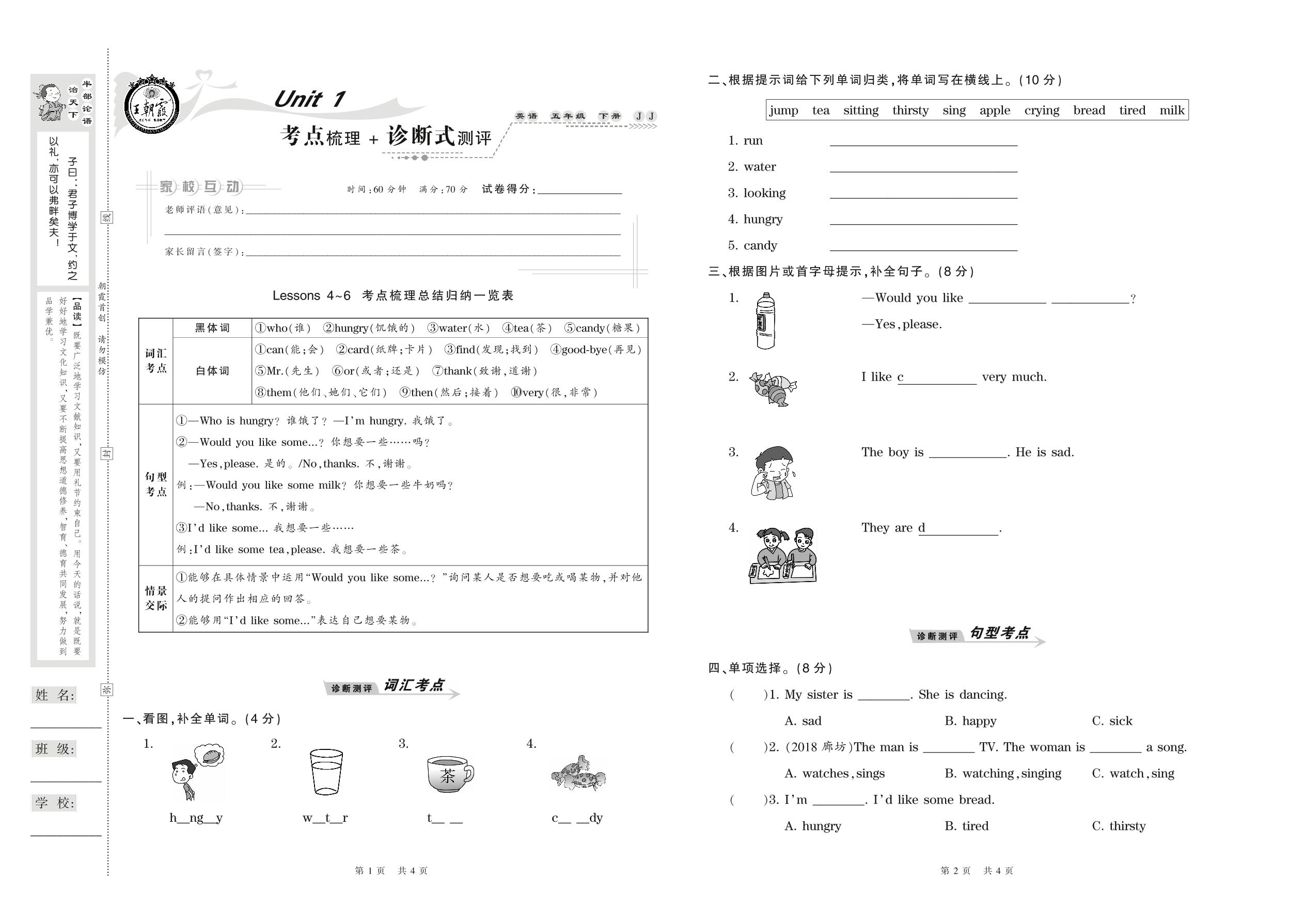 2021下册五年级英语冀教版 Unit 1 考点梳理+诊断式测评 Lessons 4-6