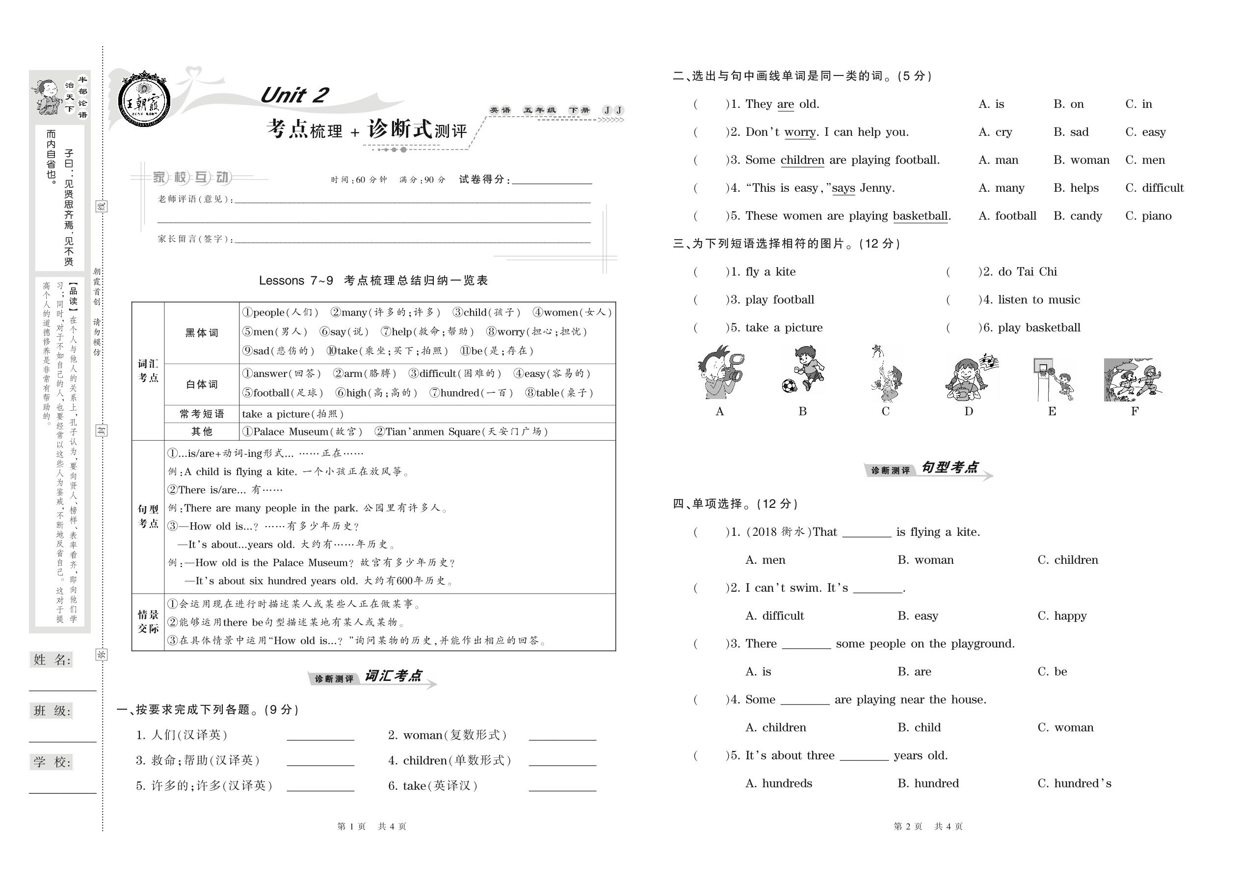 2021下册五年级英语冀教版 Unit 2 考点梳理+诊断式测评 Lessons 7-9
