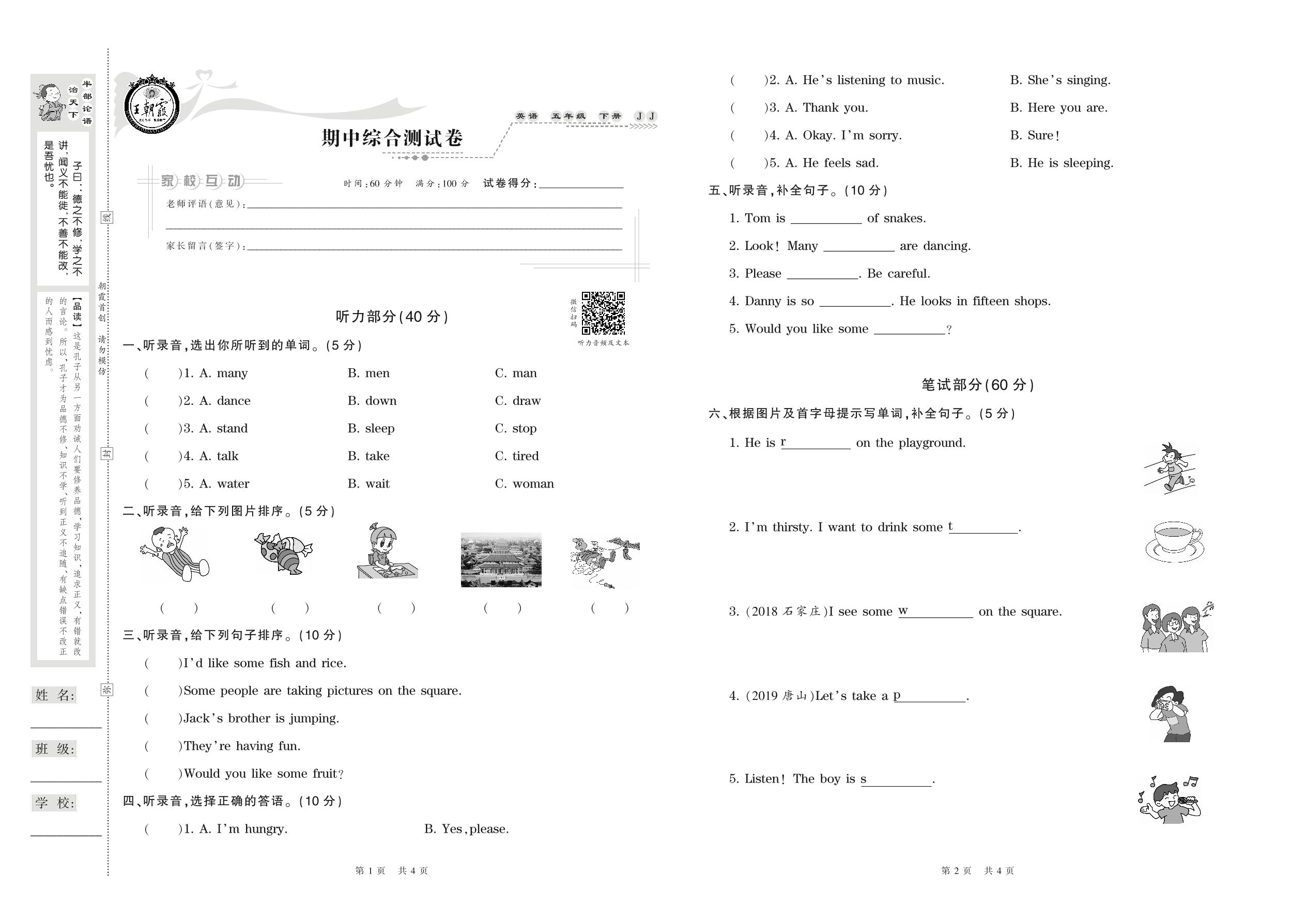 五年级英语冀教版下册期中卷