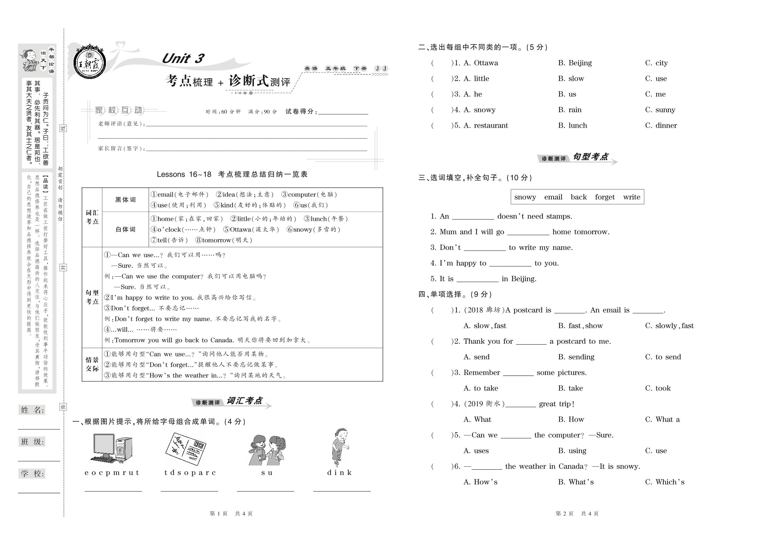 2021下册五年级英语冀教版 Unit 3 考点梳理+诊断式测评 Lessons 16-18