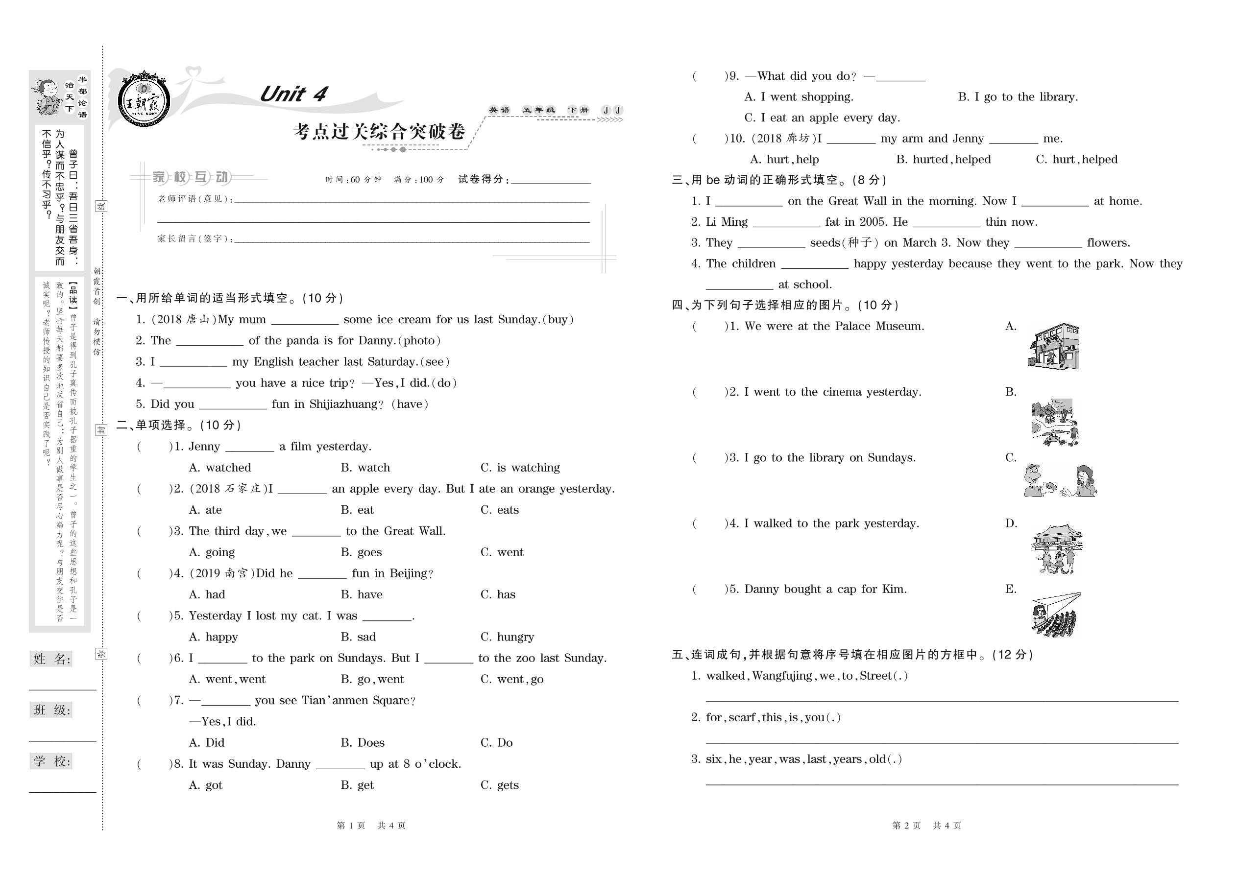 2021下册五年级英语冀教版 Unit 4 考点过关综合突破卷