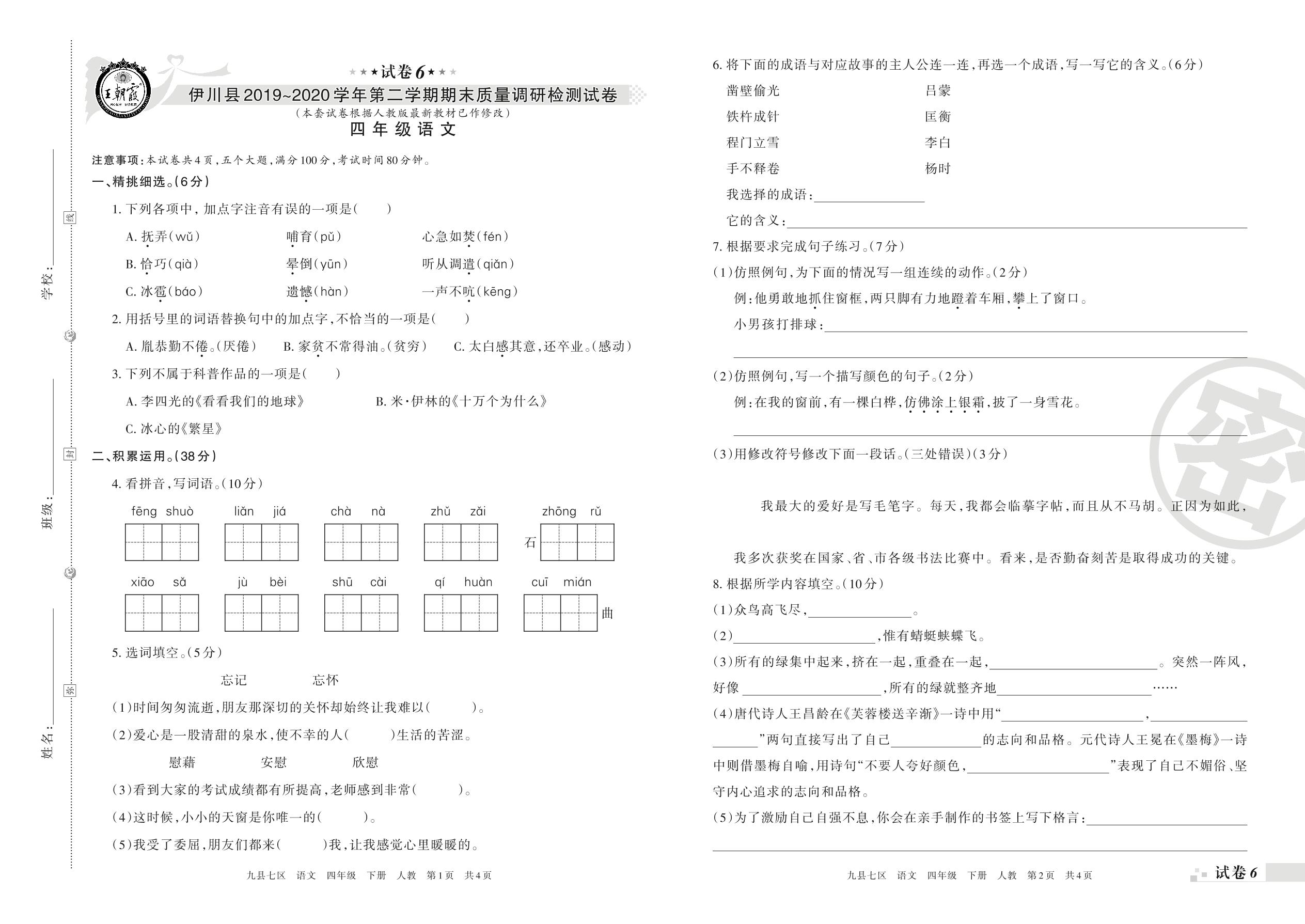 2019-2020学年第二学期洛阳市伊川县四年级语文试卷(人教版)【6】