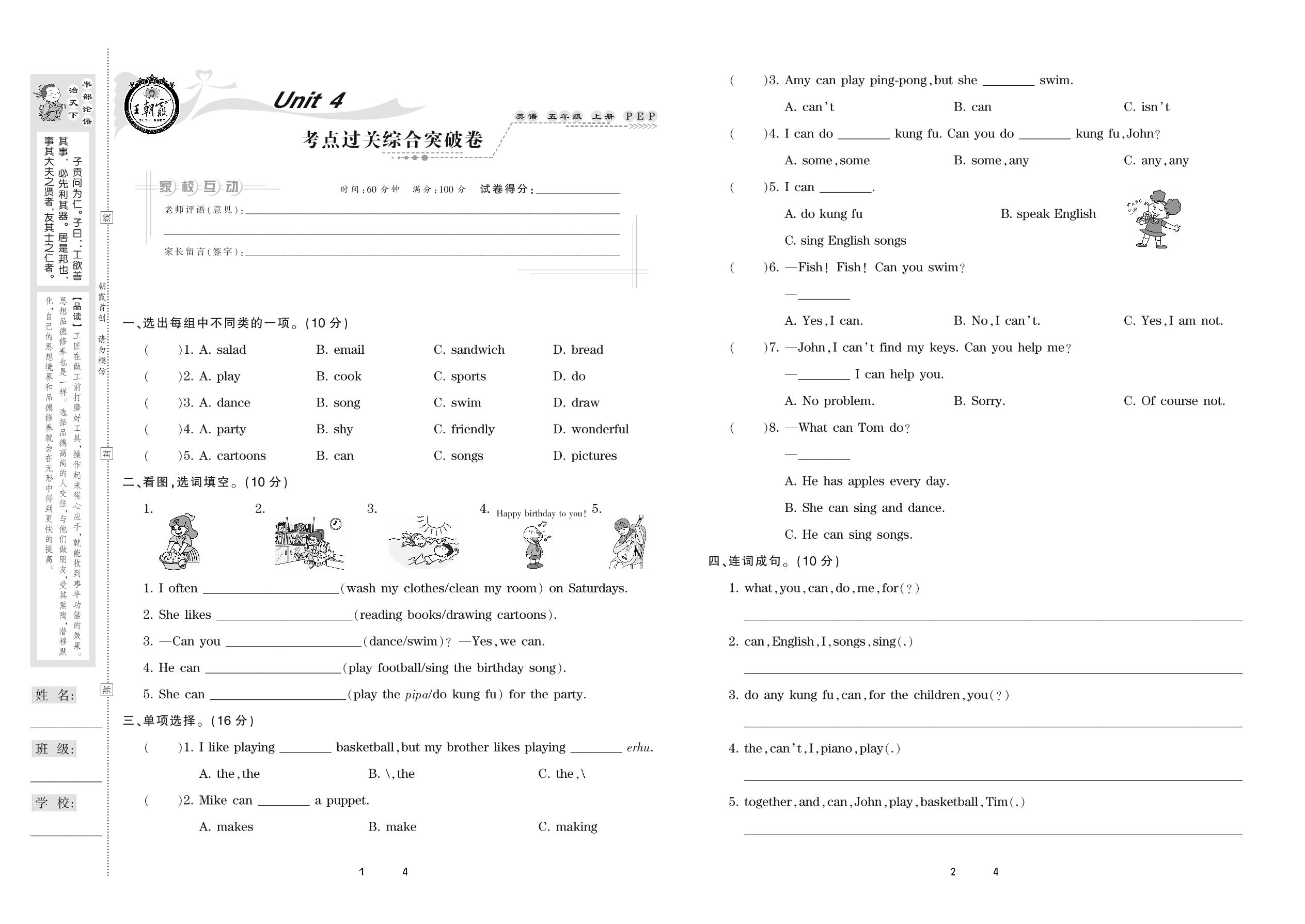 2020上册五年级英语PEP版 Unit 4 考点过关综合突破卷