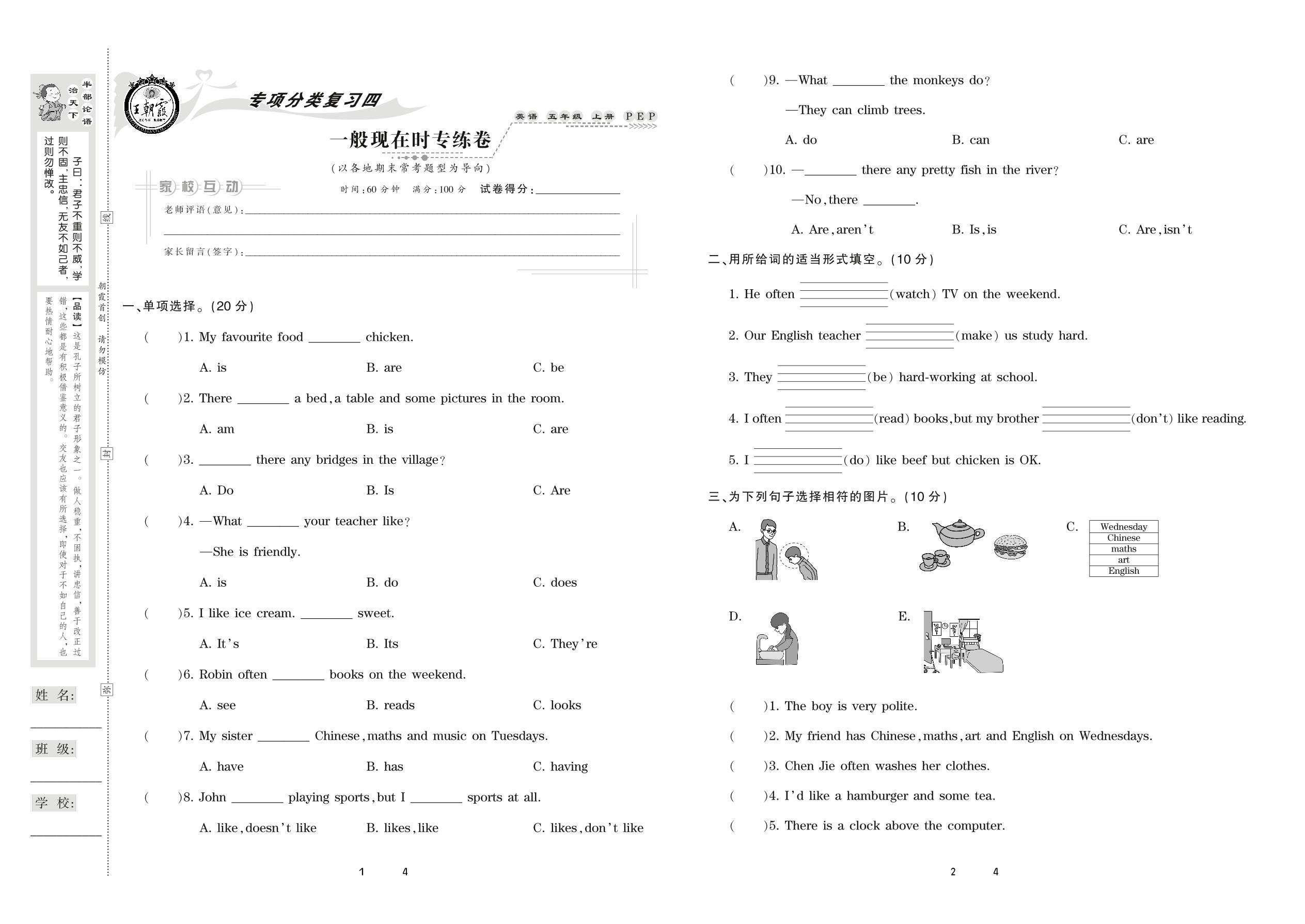 五年级英语人教PEP版(三起始)上册专项卷