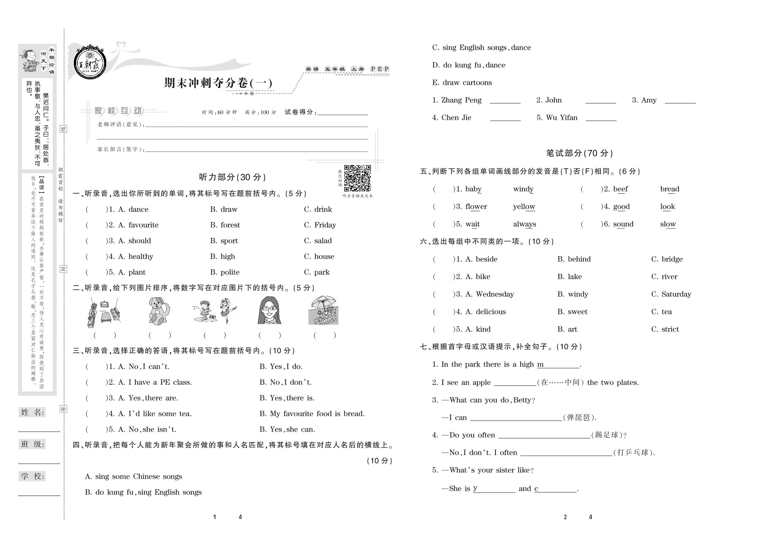2020上册五年级英语PEP版 期末冲刺夺分卷(一)