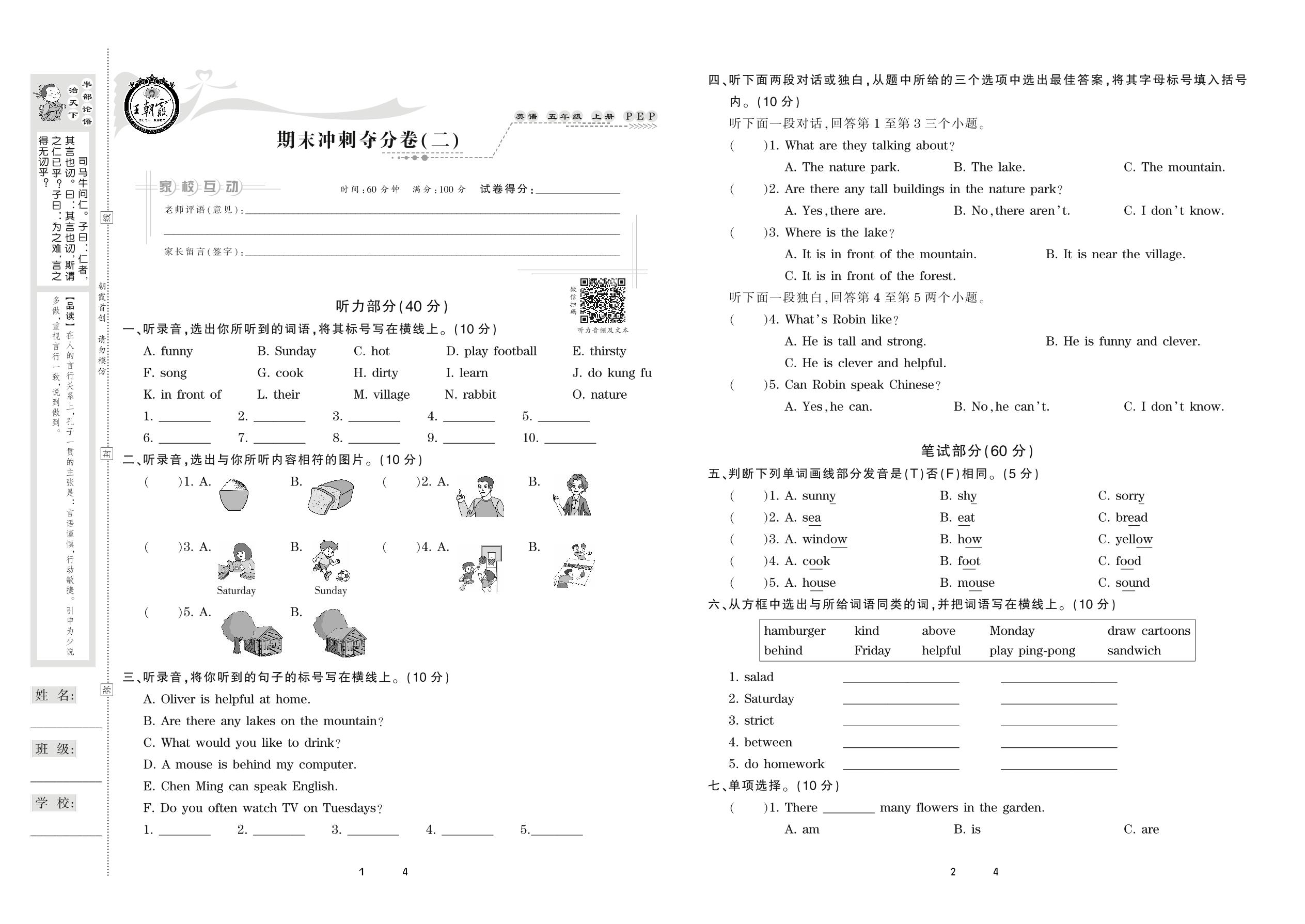 2020上册五年级英语PEP版 期末冲刺夺分卷(二)