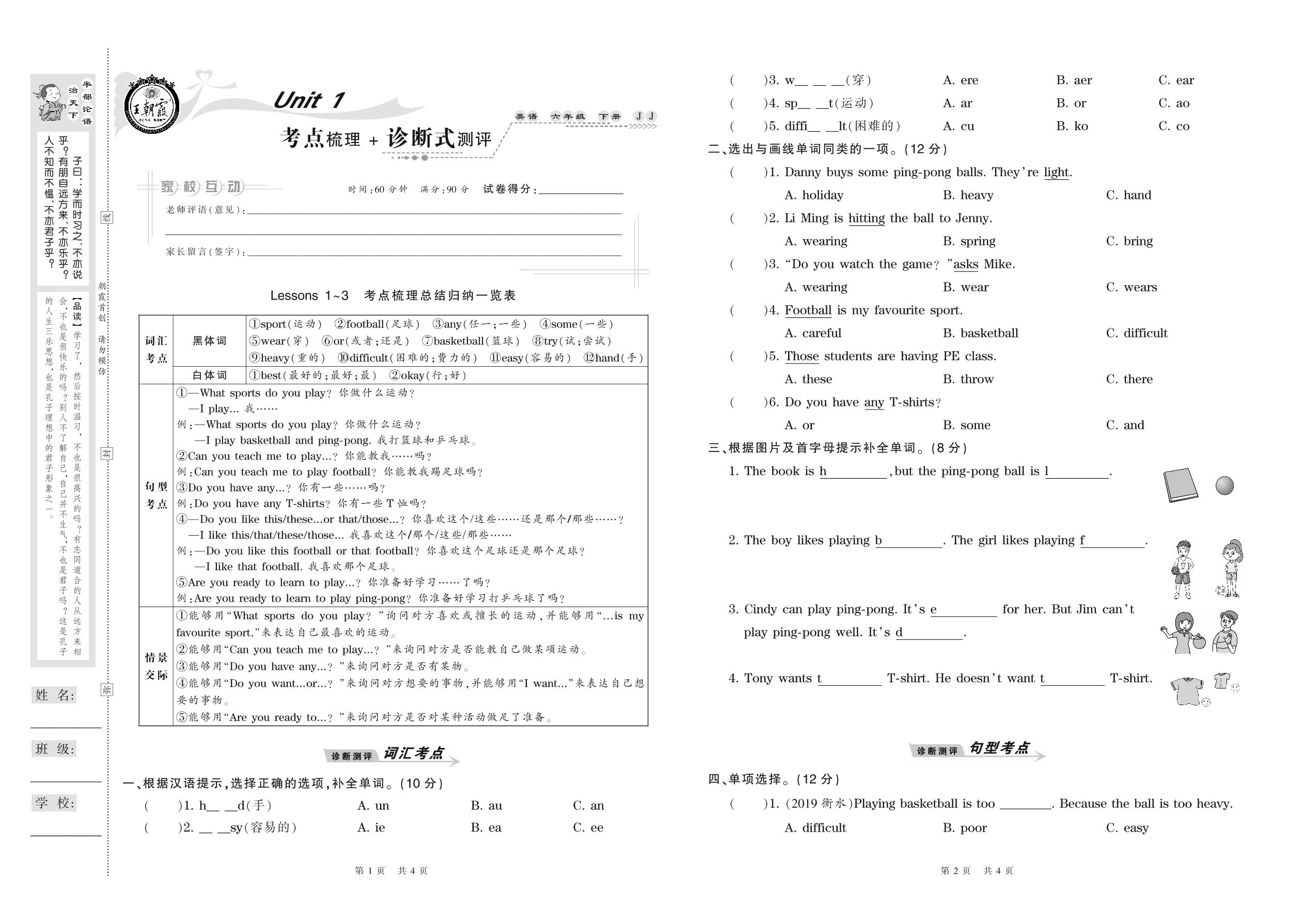 2021下册六年级英语冀教版 Unit 1 考点梳理+诊断式测评 Lessons 1-3