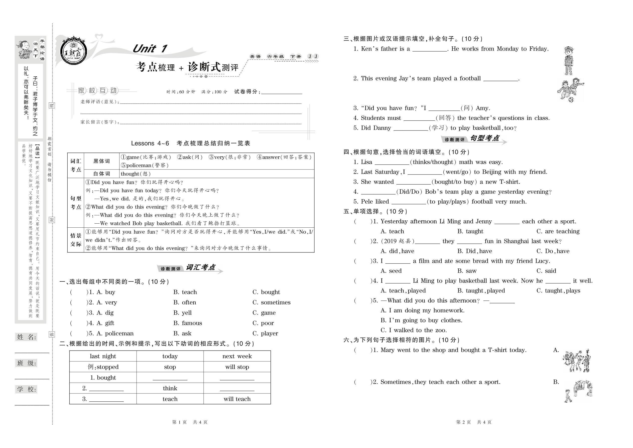2021下册六年级英语冀教版 Unit 1 考点梳理+诊断式测评 Lessons 4-6