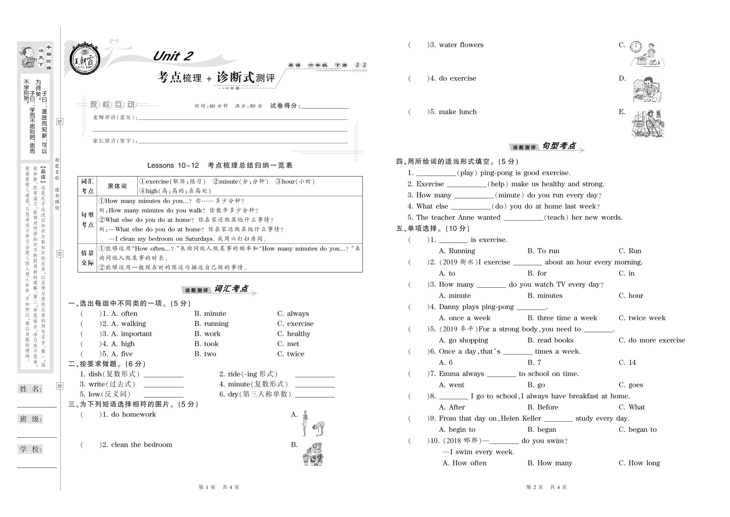 2021下册六年级英语冀教版 Unit 2 考点梳理+诊断式测评 Lessons 10-12