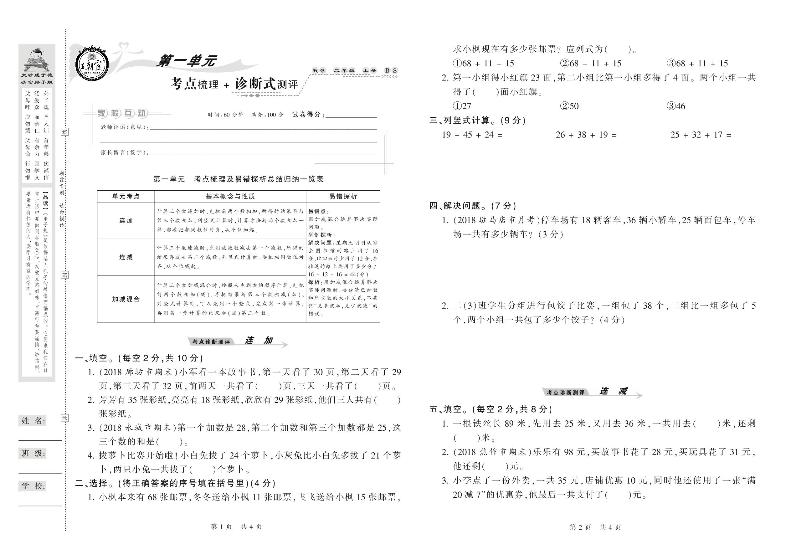 2020上册二年级数学北师版 第一单元 考点梳理+诊断式测评