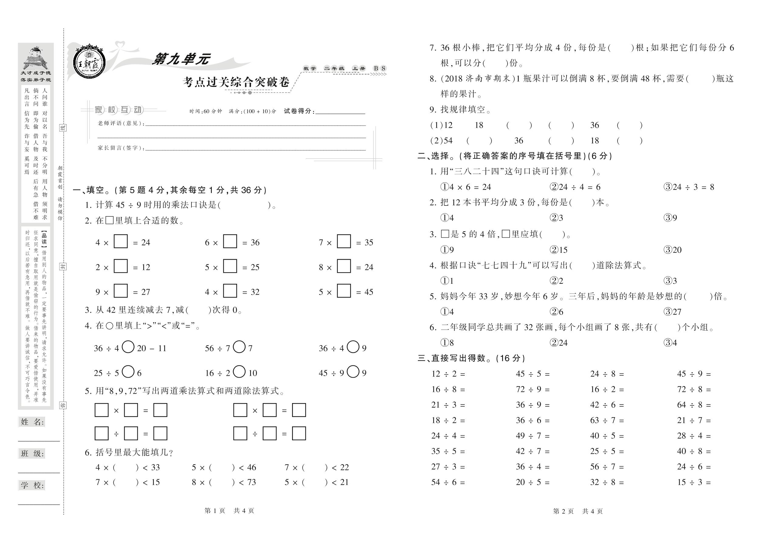 2020上册二年级数学北师版 第九单元 考点过关综合突破卷