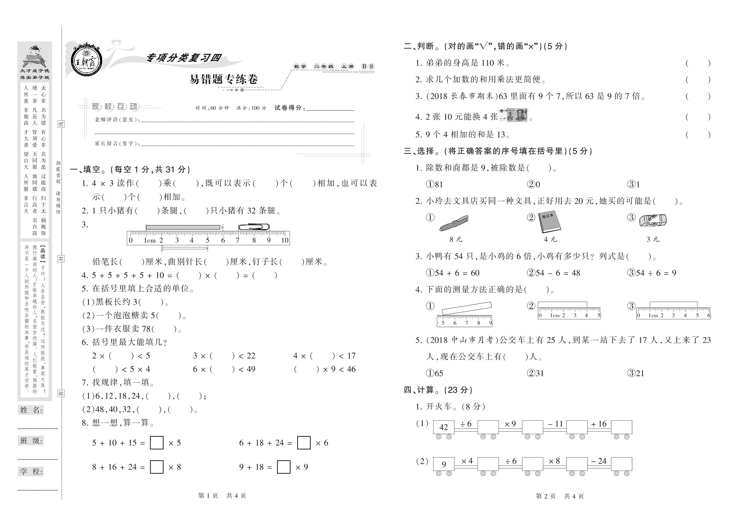 2020上册二年级数学北师版 易错题专练卷