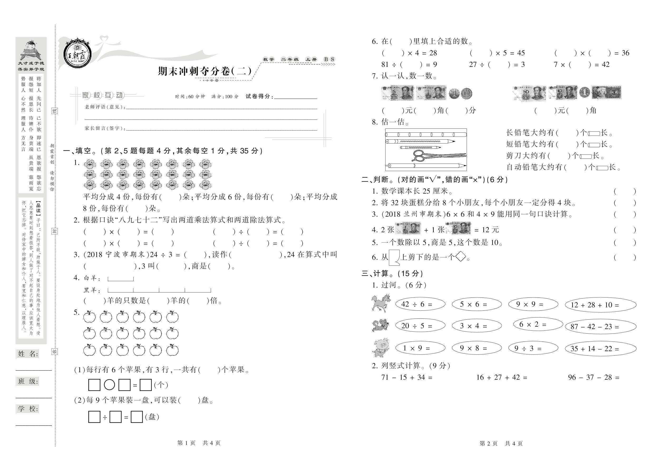 2020上册二年级数学北师版 期末冲刺夺分卷(二)