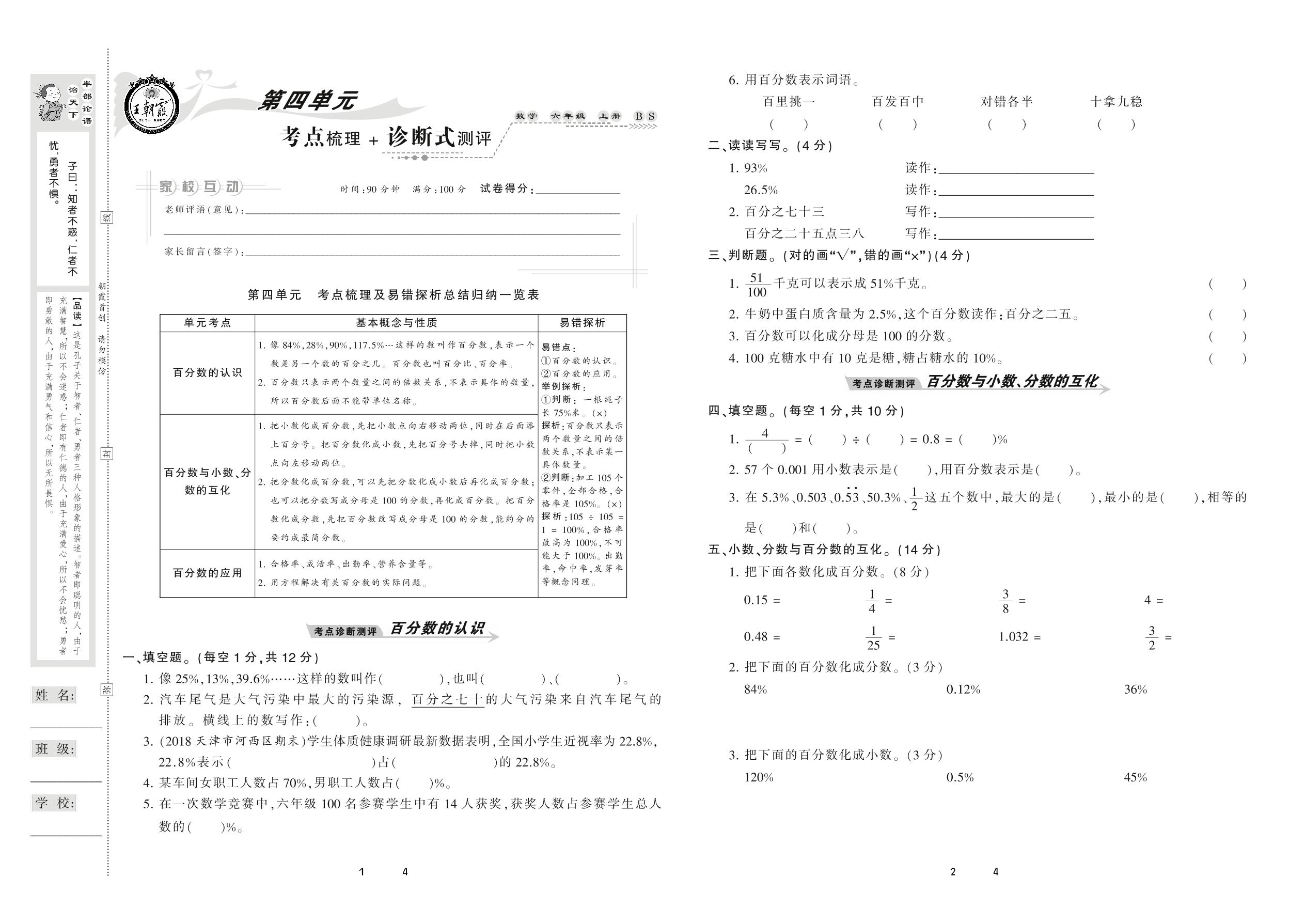 2020上册六年级数学北师版 第四单元 考点梳理+诊断式测评