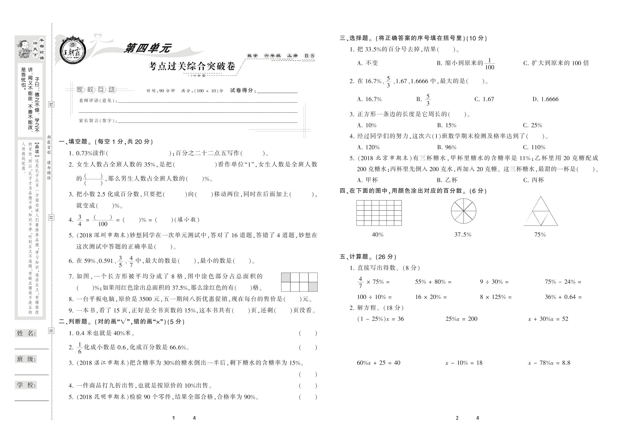 2020上册六年级数学北师版 第四单元 考点过关综合突破卷