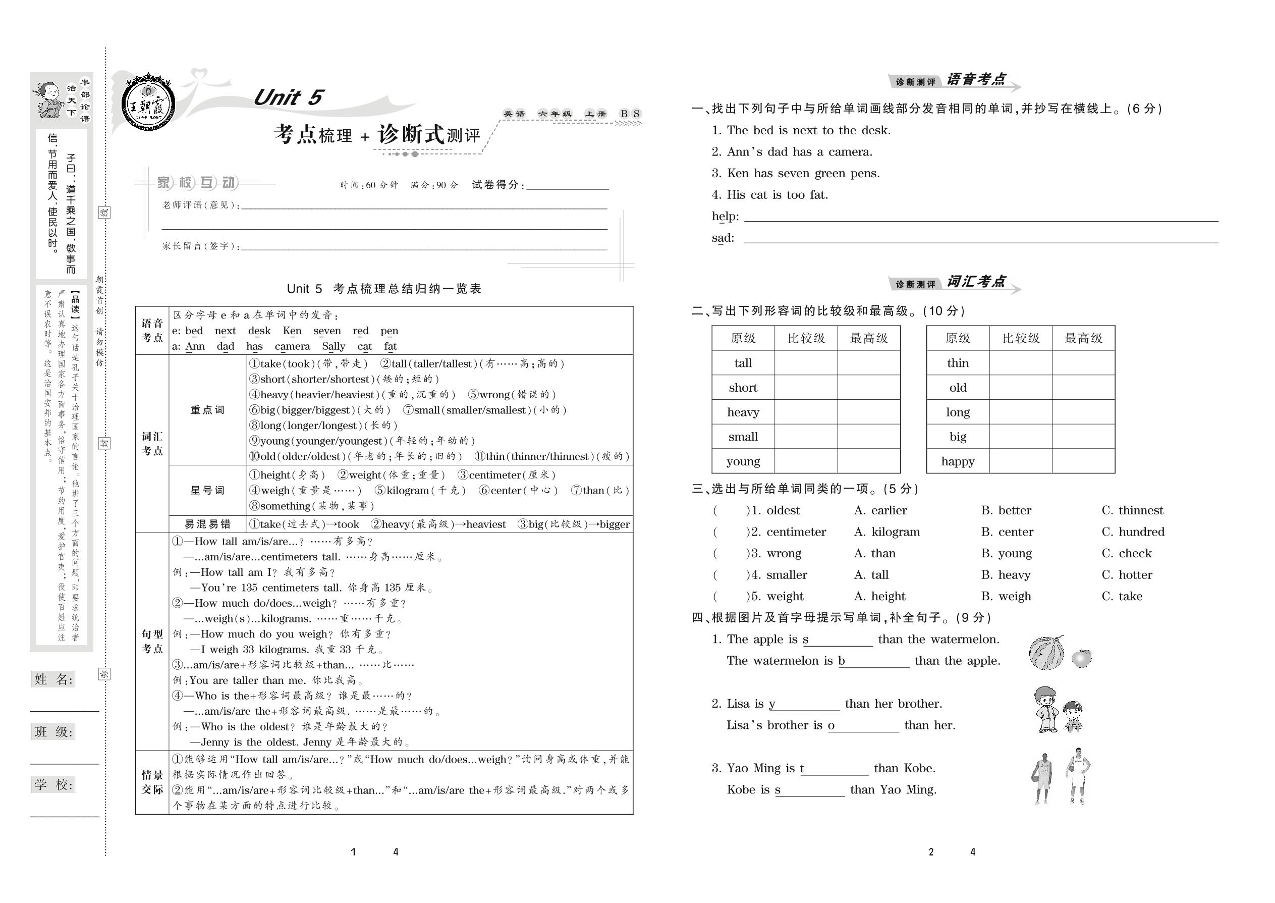 2020上册六年级英语北师版 Unit 5 考点梳理+诊断式测评