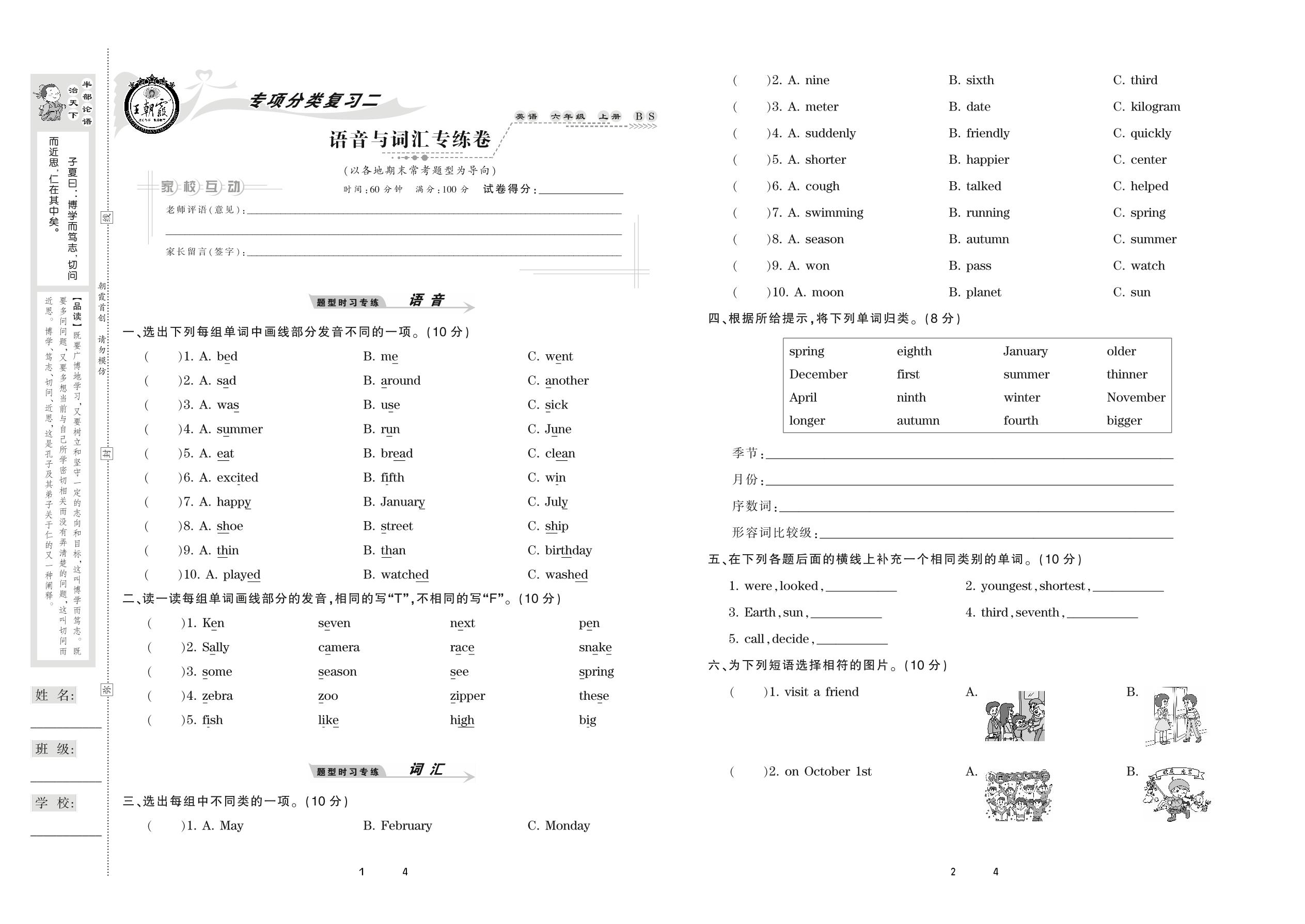 2020上册六年级英语北师版 语音与词汇专练卷