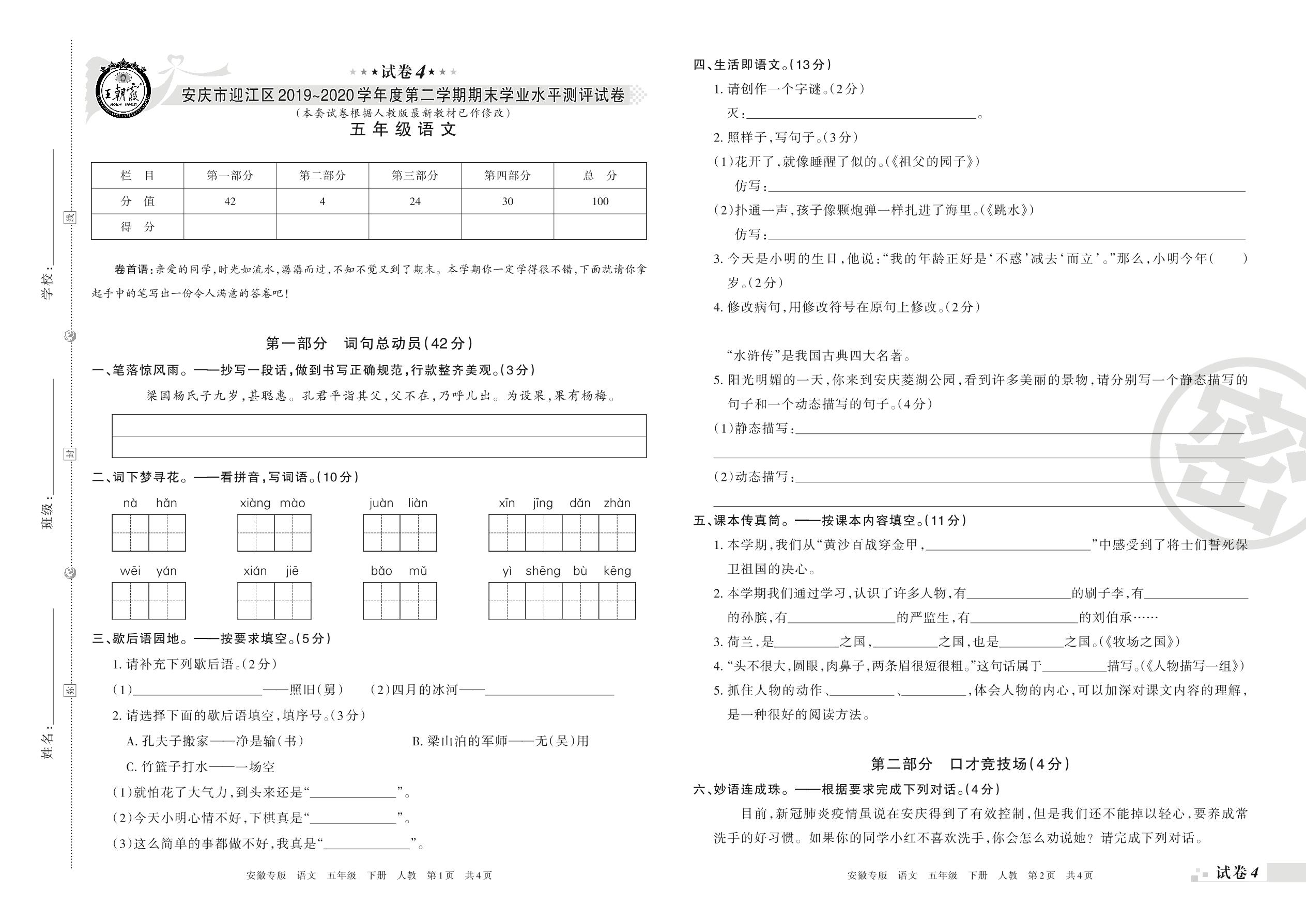 2019-2020学年第二学期安庆市迎江区五年级语文试卷(人教版)【4】