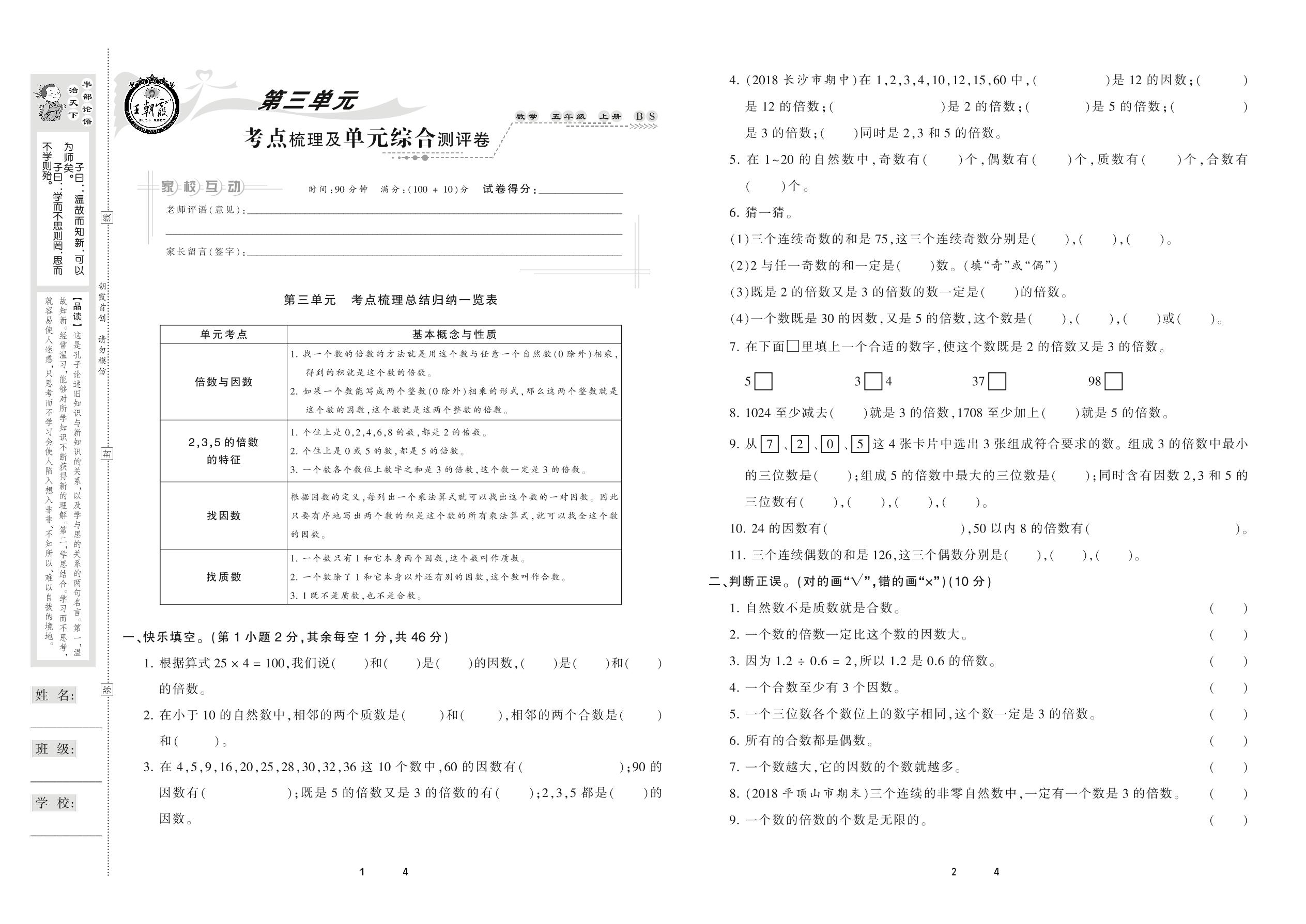 2020上册五年级数学北师版 第三单元 考点梳理及单元综合测评卷