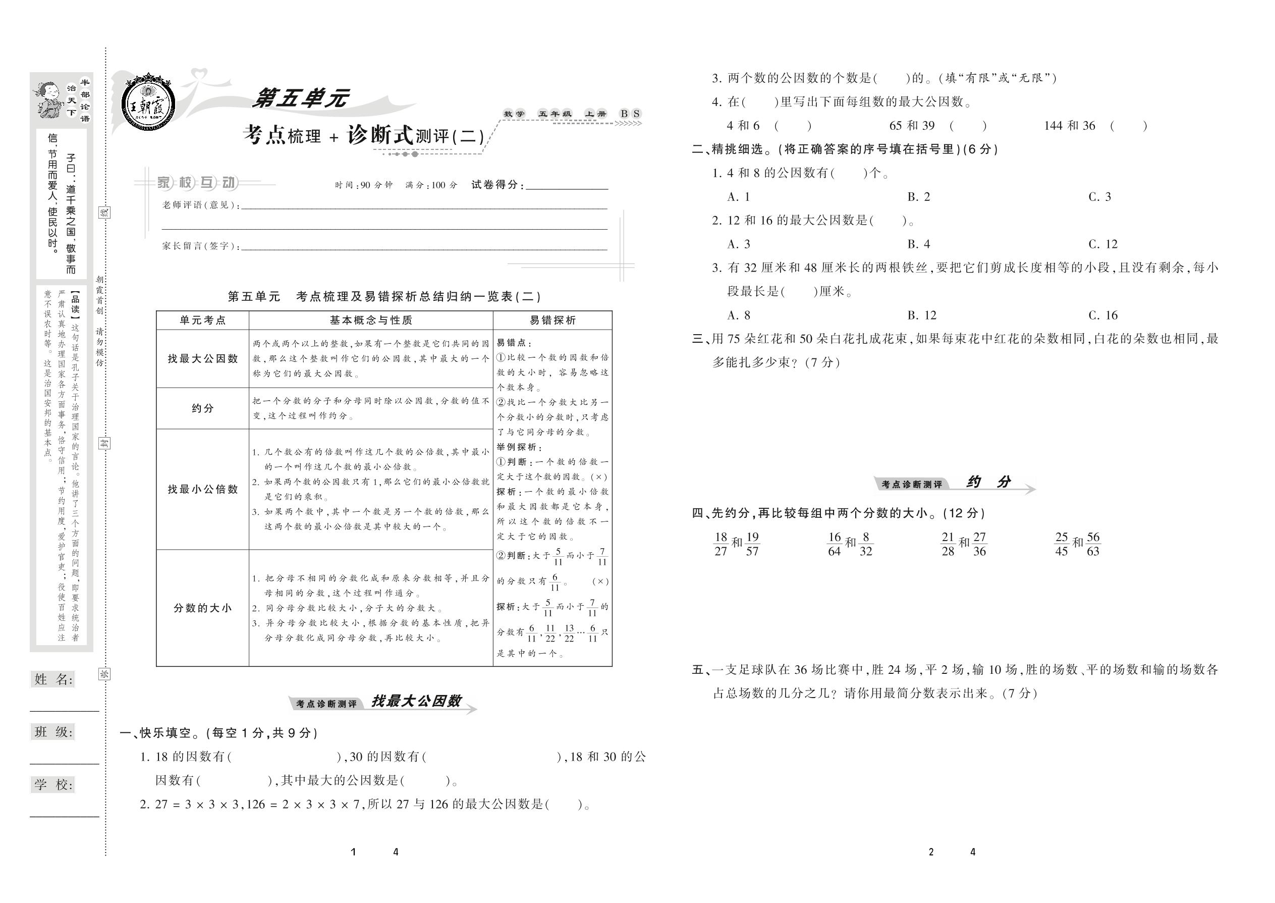 2020上册五年级数学北师版 第五单元 考点梳理+诊断式测评(二)