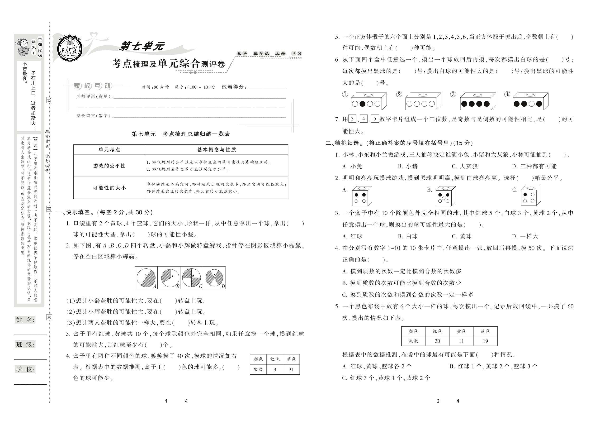 2020上册五年级数学北师版 第七单元 考点梳理及单元综合测评卷