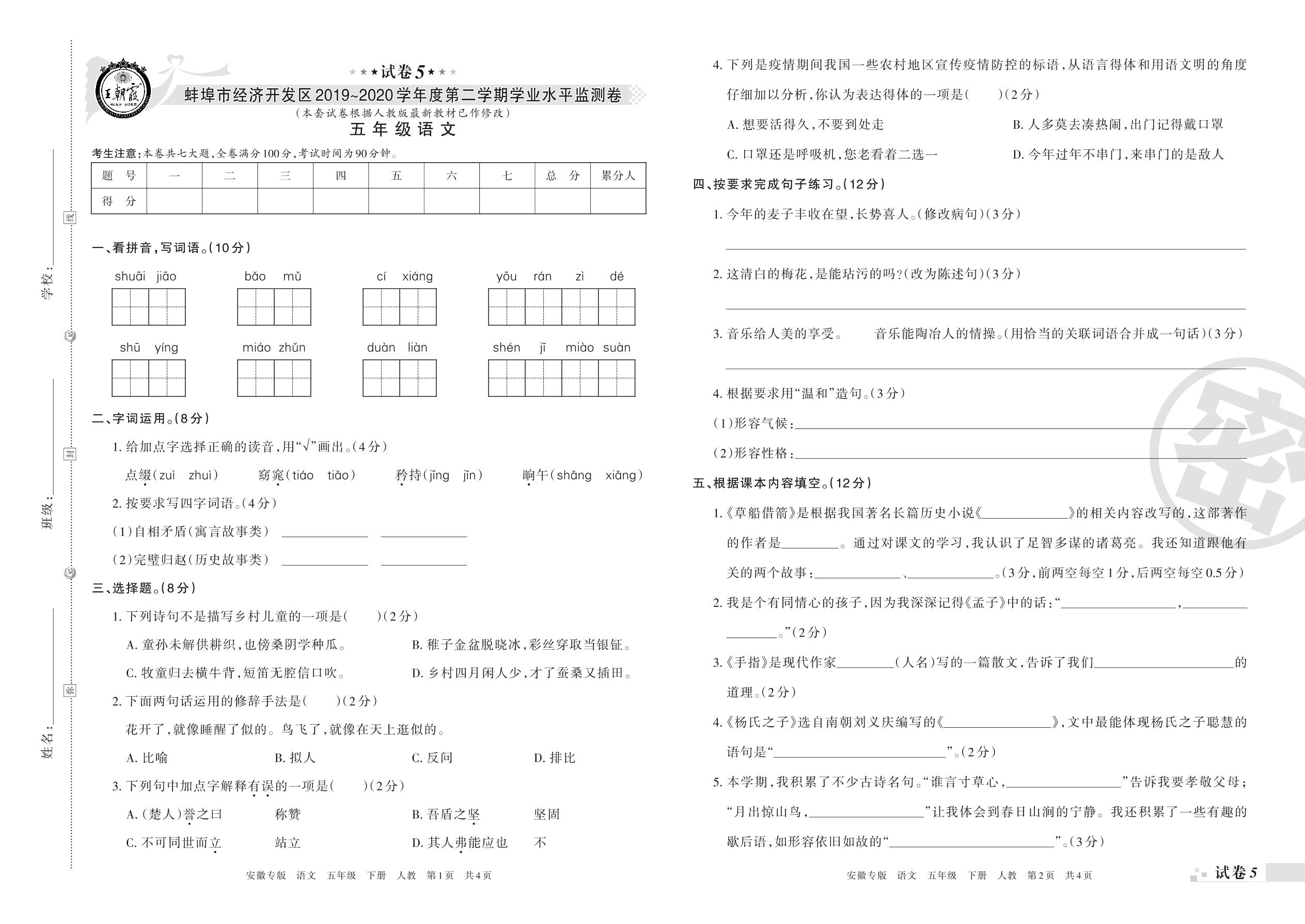 2019-2020学年第二学期蚌埠市经济开发区五年级语文试卷(人教版)【5】
