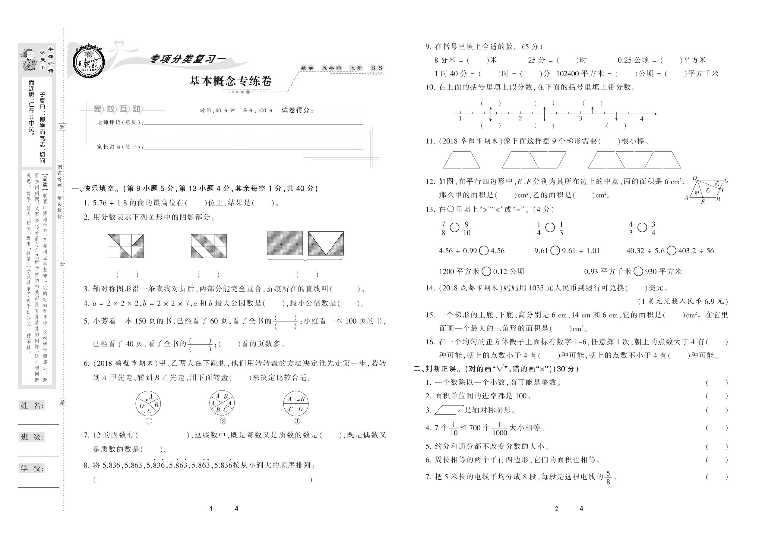 2020上册五年级数学北师版 基本概念专练卷