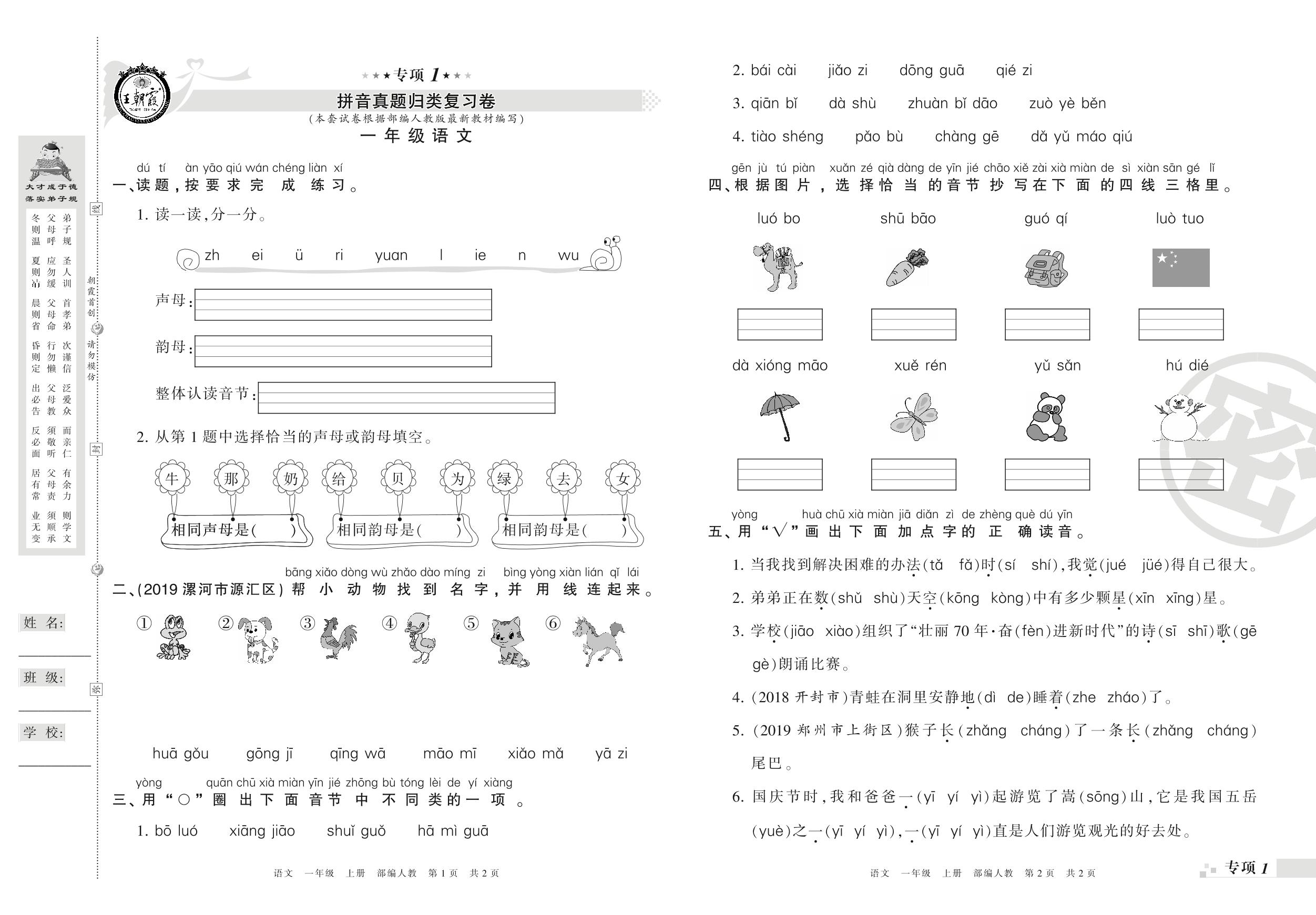 王朝霞期末专项卷——拼音、汉字真题归类复习卷一年级上册语文(人教版)_R210731180809【0】