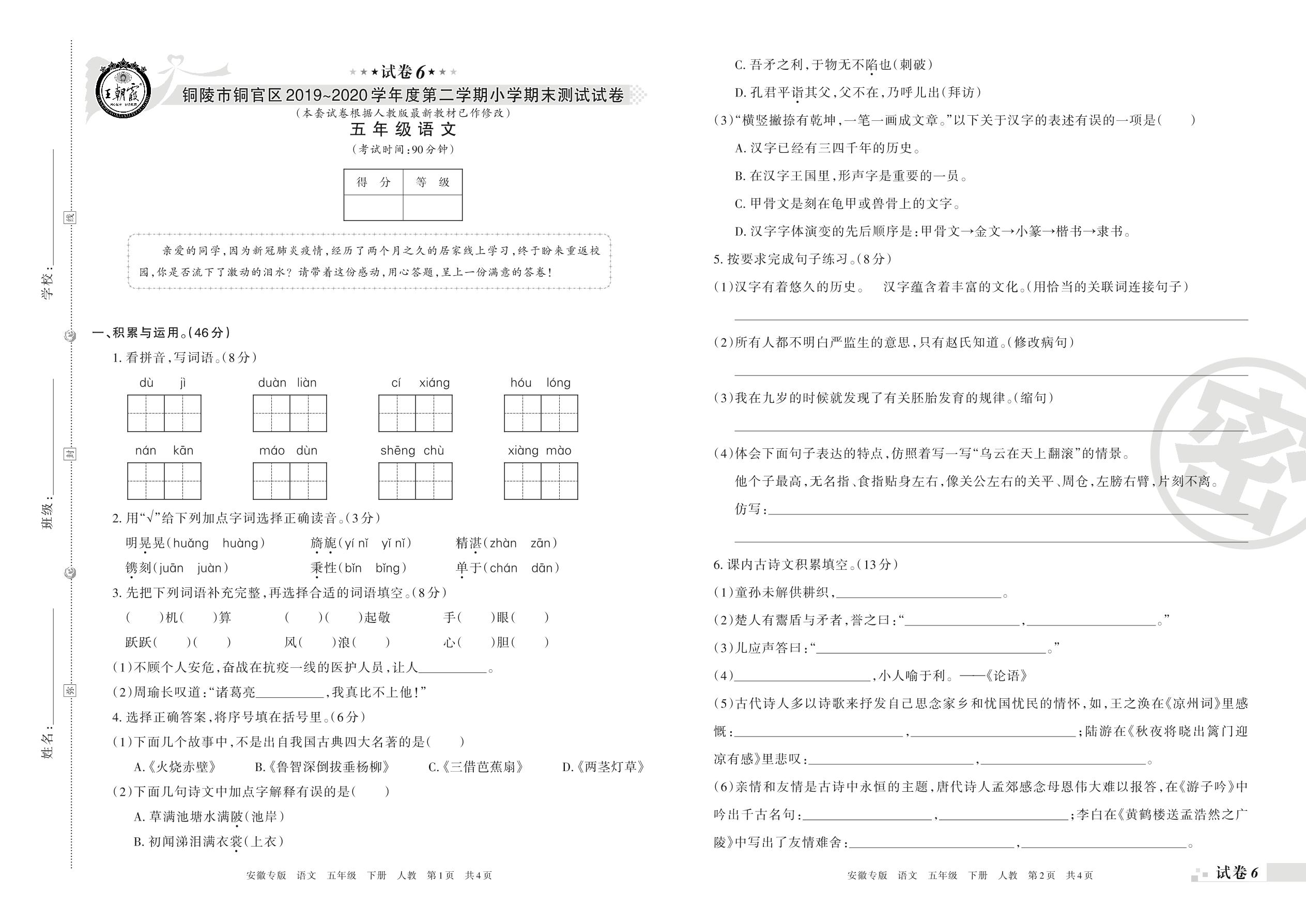 2019-2020学年第二学期铜陵市铜官区五年级语文试卷(人教版)【6】