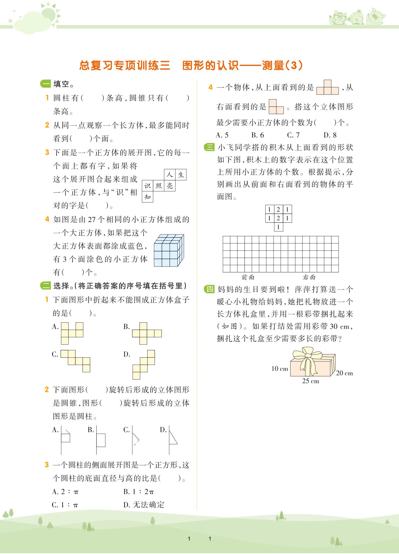 2021下册六年级数学苏教版 第七单元 总复习 图形与几何——总复习专项训练三 图形的认识 测量(3)