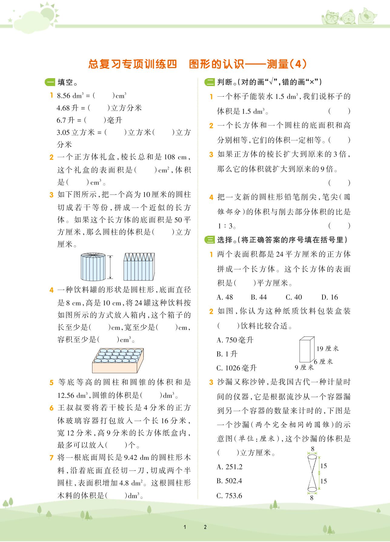 2021下册六年级数学苏教版 第七单元 总复习 图形与几何——总复习专项训练四 图形的认识 测量(4)